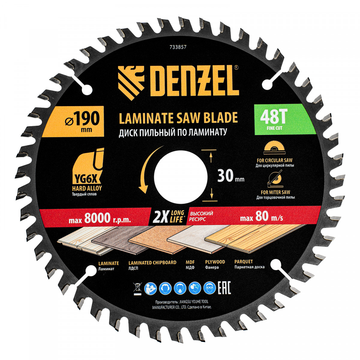 Пильный диск по ламинату ф190 х 30 мм, 48 зубьев Denzel