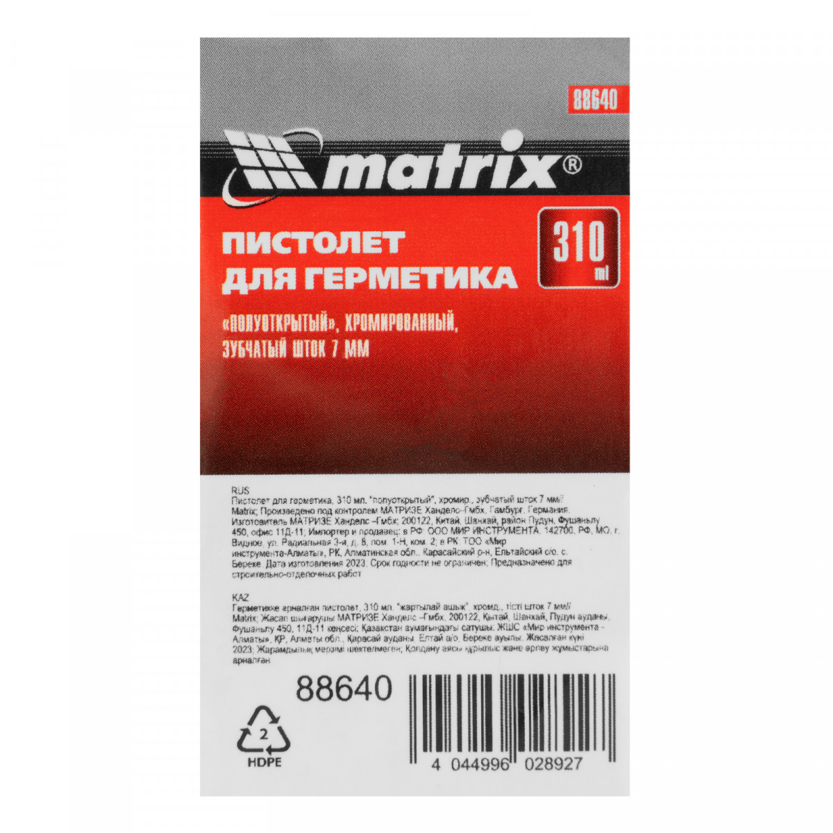 Пистолет для герметика, 310 мл, "полуоткрытый", хромированный, зубчатый шток 7 мм Matrix