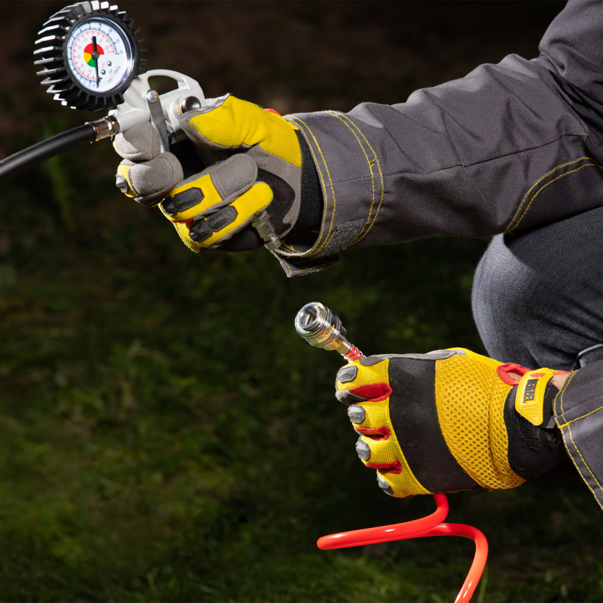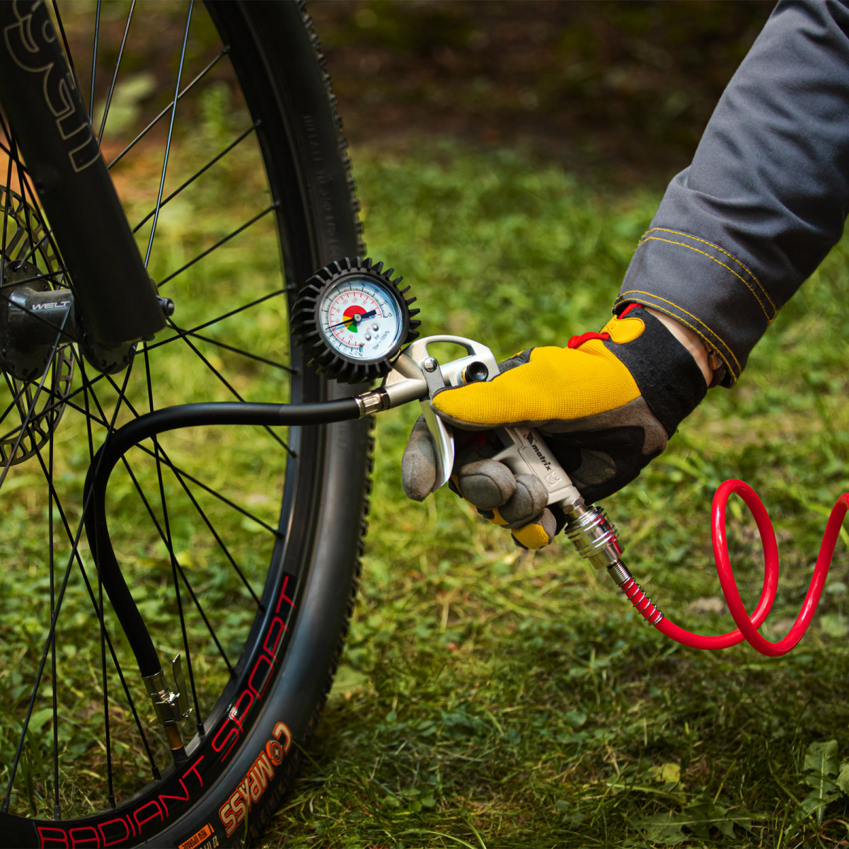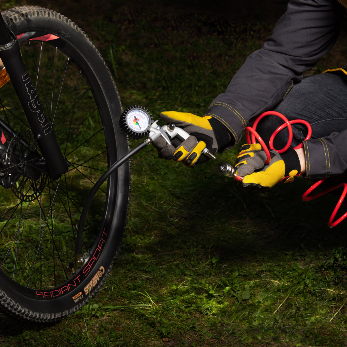 • Контроль параметров работы — 2 шкалы на манометре (Пси и Бар) позволяют отслеживать и регулировать давление в шинах.