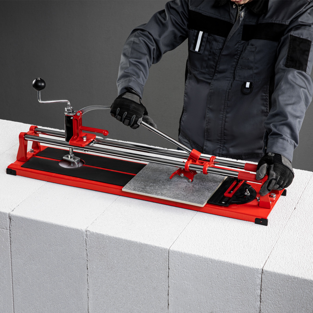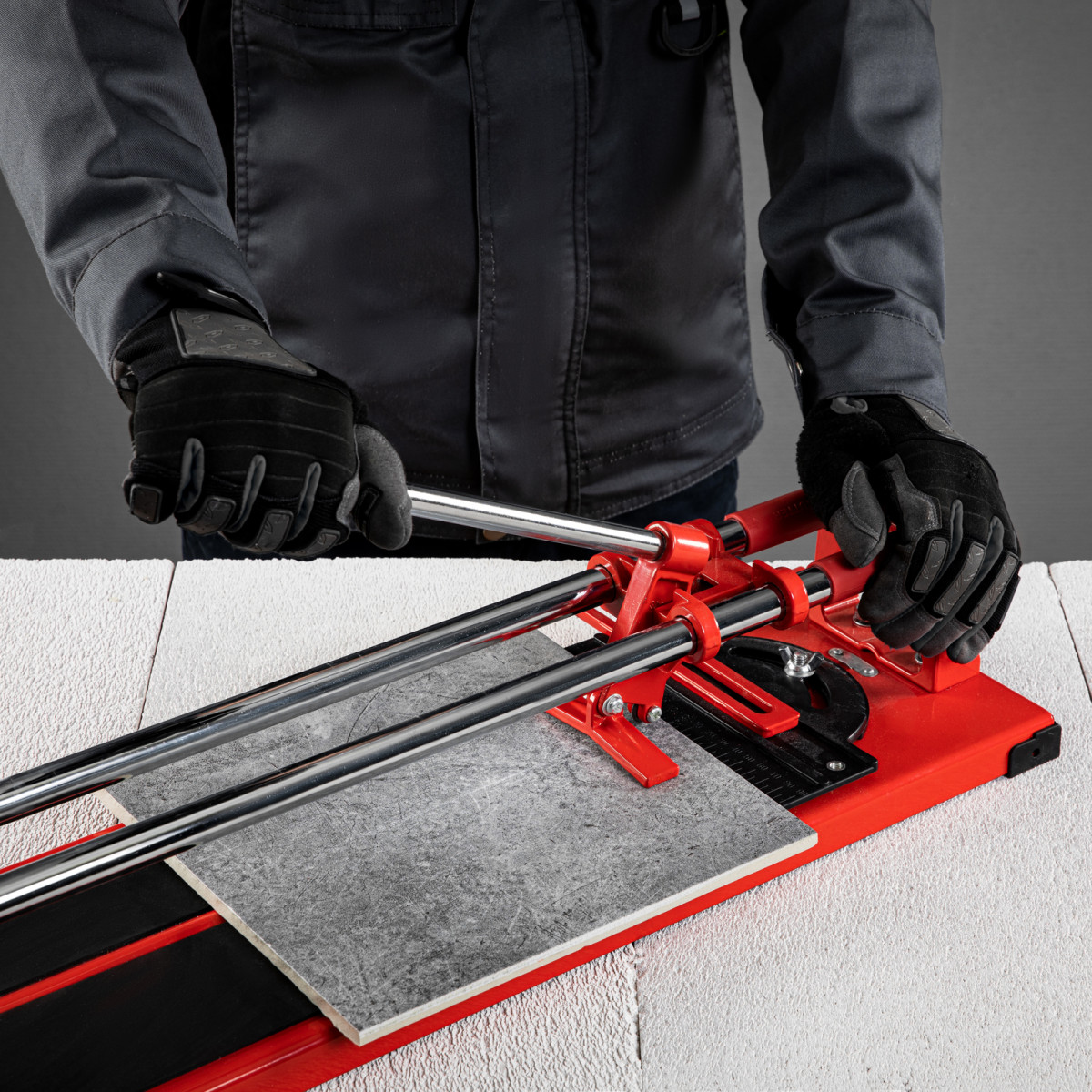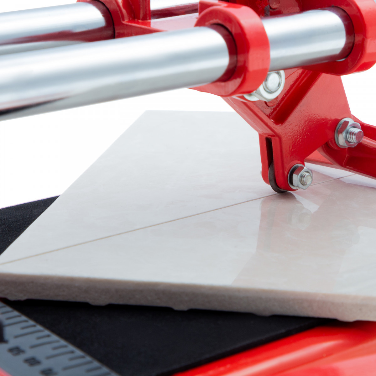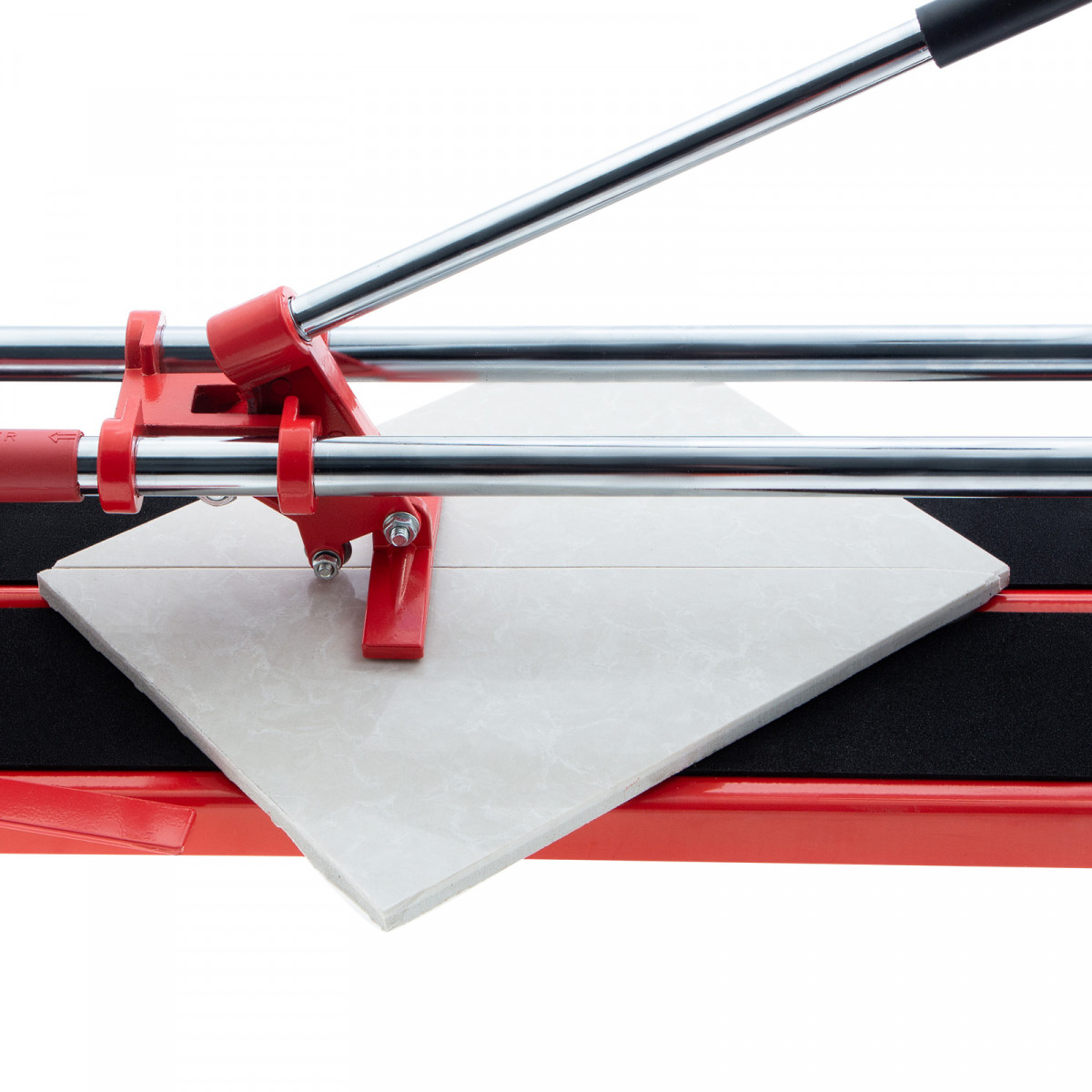 • Неподвижность плитки — плиткорез с широким основанием снабжен мягкими амортизирующими накладками, угольник-угломер дополнительно фиксирует заготовку.