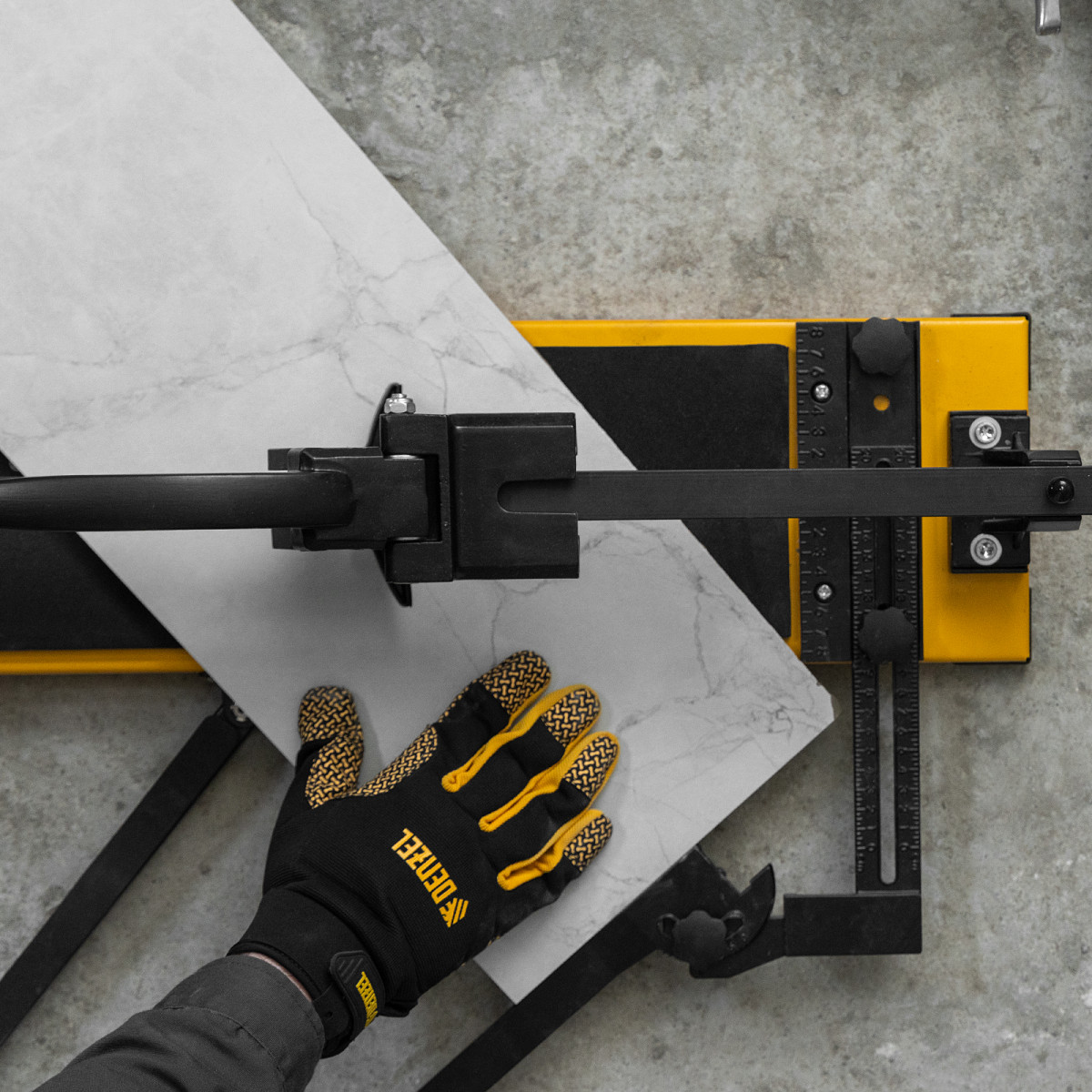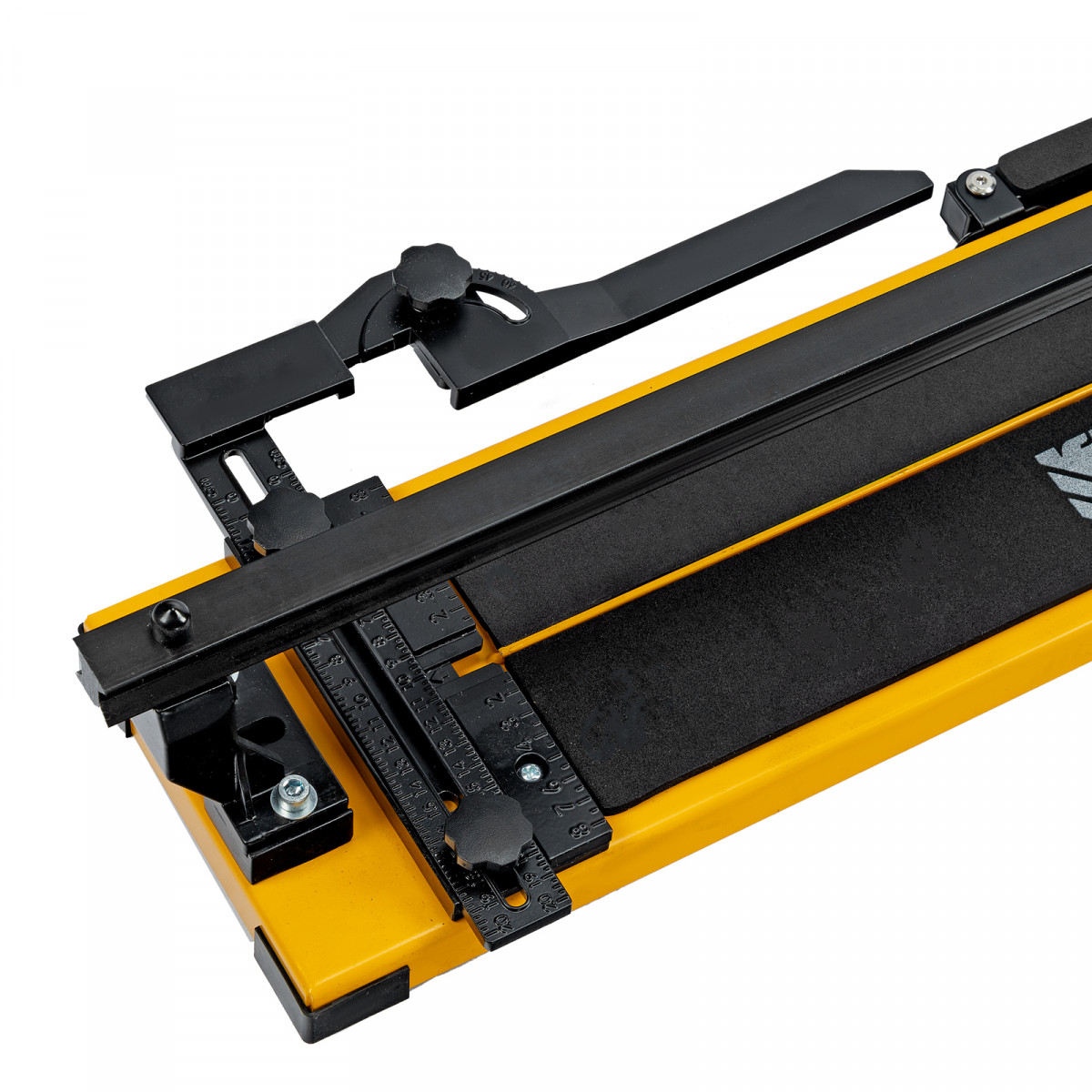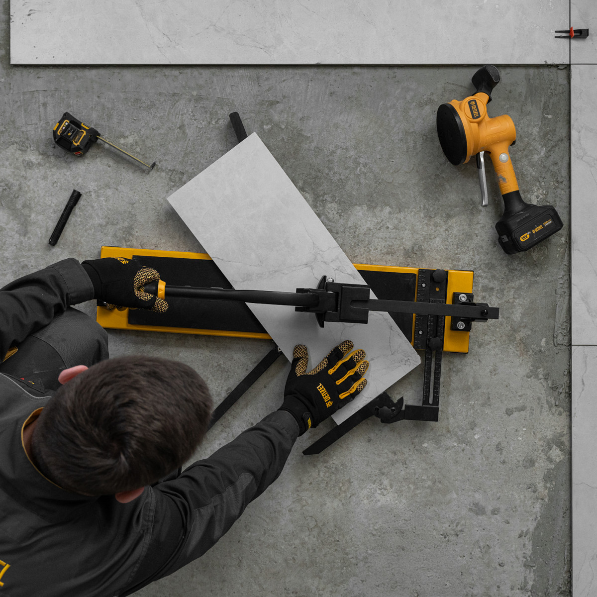 - Удобная работа — благодаря противоскользящим накладкам плиткорез не смещается даже на гладких поверхностях.