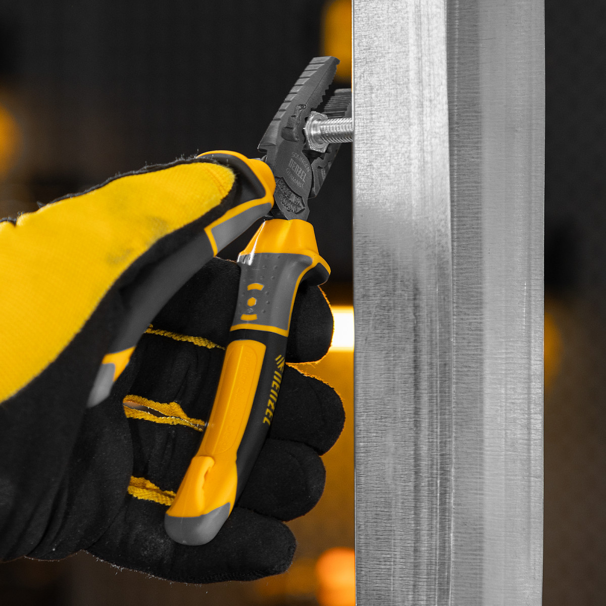 Комбинированные плоскогубцы Denzel 17081 длиной 180 мм, с трехкомпонентными рукоятками, используются для зажима и удержания деталей, сгибания металлических листов. Позволяют также перекусывать мягкую проволоку (алюминиевую, медную, с пределом прочности 220 Н/мм2) диаметром до 5,2 мм, проволоку средней жесткости и гвозди (750 Н/мм2) диаметром до 3,4 мм, а также жесткую (1800 Н/мм2) толщиной до 2,2 мм. Имеют внутренние грани специальной формы, предназначенные для использования инструмента в качестве гаечного ключа. Губки с насечками надежно удерживают заготовки. Плоскогубцы пригодятся профессионалу и частному мастеру при проведении слесарных, ремонтных и сборочных работ.