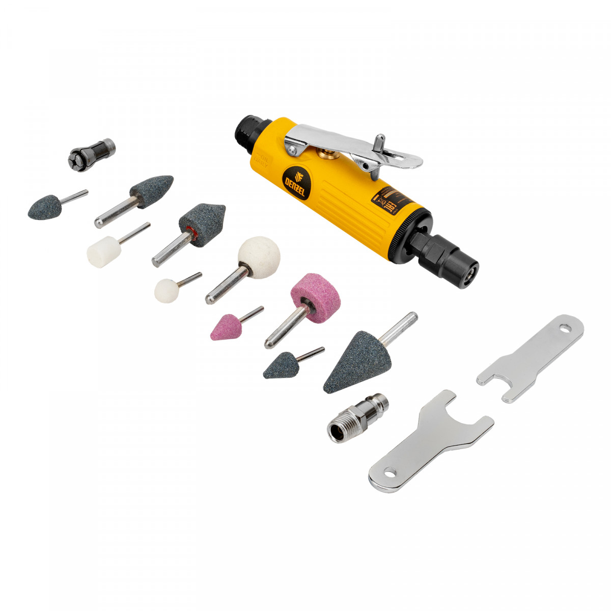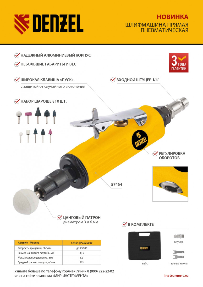 Пневмошлифмашина прямая PGS25000, 25000 об/мин, 10 шлиф. камней, цанга - 3, 6 мм, 113 л/мин Denzel