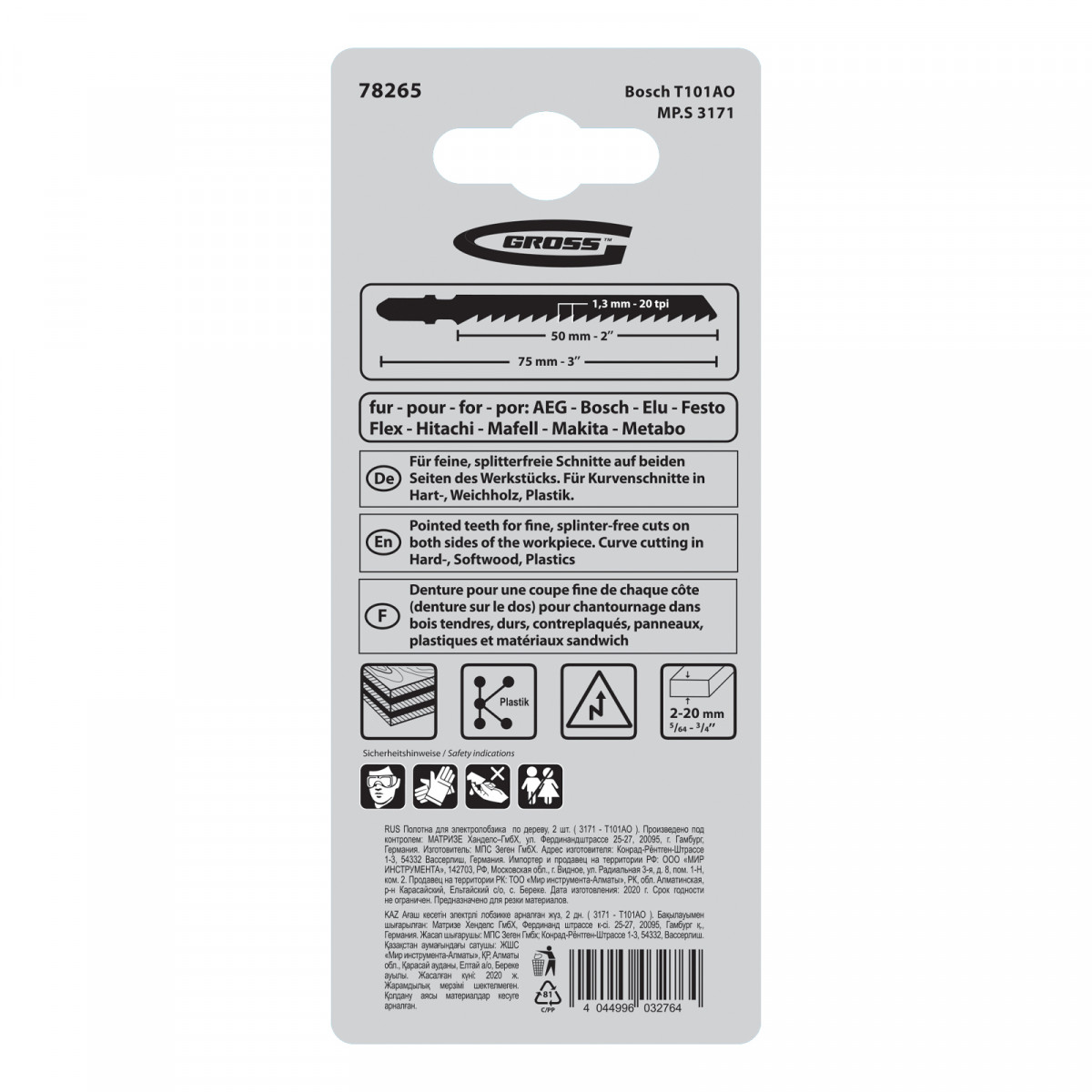 Полотна для электролобзика по дереву Gross 3161 — T101AO 78265, 2 шт. в упаковке, используются для профессиональных работ с древесиной мягких и твердых пород, ДСП, ДВП и композитными материалами на основе древесины. Полотна с длиной рабочей части 75 мм подходят для криволинейного распила заготовок толщиной 2-20 мм, пригодятся во время строительства и ремонта.