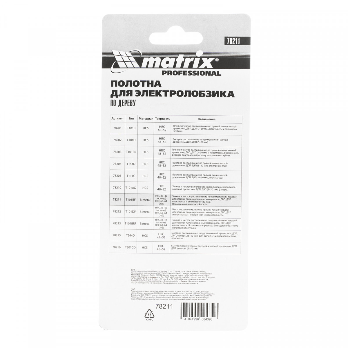 Полотна для электролобзика T101BF Matrix 78211 с шагом зубьев 2,5 мм, биметаллические (Bimetal), 3 шт. в упаковке, имеют рабочую длину 75 мм и используются для работ по дереву. Позволяют распилить фанеру, древесину, ДСП толщиной до 30 мм, эффективны для работы с клееными и ламинированными материалами. Шлифованные зубья позволяют получить тонкий и чистый распил. Полотна можно устанавливать на электролобзики с зажимом под Т-образный хвостовик. Пилки пригодятся во время ремонта и для решения бытовых задач.