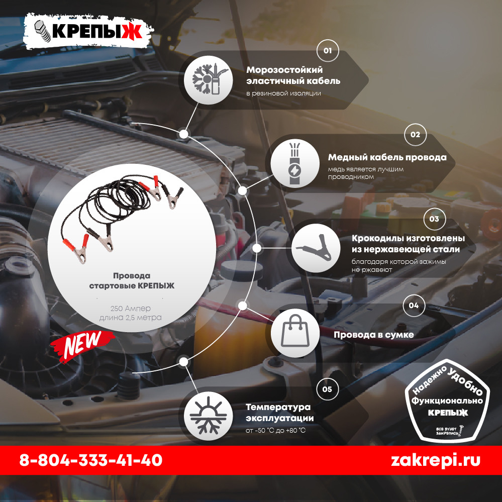Стартовые провода КРЕПЫЖ предназначены для запуска двигателей легковых и грузовых автомобилей с разряженной аккумуляторной батареей при любых погодных условиях. Благодаря высокому качеству наши провода служат дольше, чем провода других производителей. • Морозостойкий эластичный кабель в резиновой изоляции - позволяет проводу оставаться эластичным даже в самый суровый мороз. • Медный кабель провода - медь является лучшим проводником. • Концы провода луженые - что позволяет избежать окисления и сохранить проводниковые свойства. • Крокодилы изготовлены из нержавеющей стали, благодаря которой зажимы не ржавеют в отличии крокодилов из оцинкованного металла, где со временем слой цинка становится меньше и появляется коррозия. • Соединение провода с крокодилом запрессованное - исключает отсоединение и потерю контакта. • Заявленная длина провода рассчитана без длины крокодилов. Дает дополнительный запас длины и удобства в эксплуатации. • Температура эксплуатации от- 50 С до + 80 С