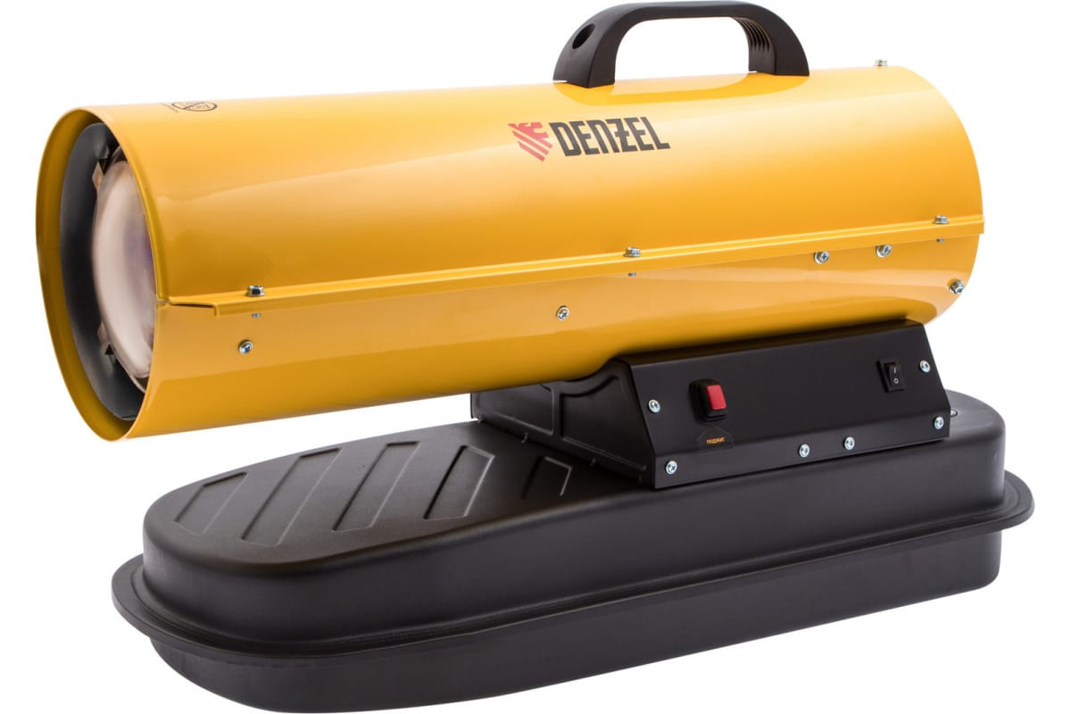 Дизельная тепловая пушка Denzel DHG-10, 10 кВт, 300 м3/ч, прямой нагрев 96481 имеет высокую тепловую мощность и применяется для обогрева нежилых помещений: цехов, хранилищ и ангаров. Также ее используют на строительных площадках для просушивания стен, разморозки траншей, подогрева бетона. Во время арктических экспедиций дизельные тепловые пушки также часто выступают генератором тепла. Тепловая пушка отличается высокой производительностью 300 м3/ч при экономичном расходе топлива 1,0 л/ч. Полного бака 12 л хватит примерно на 12 часов работы без дозаправки. Важно: при использовании дизельной тепловой пушки в помещении, где работают люди - необходимо обеспечить вентиляцию для удаления продуктов горения и приток свежего воздуха.