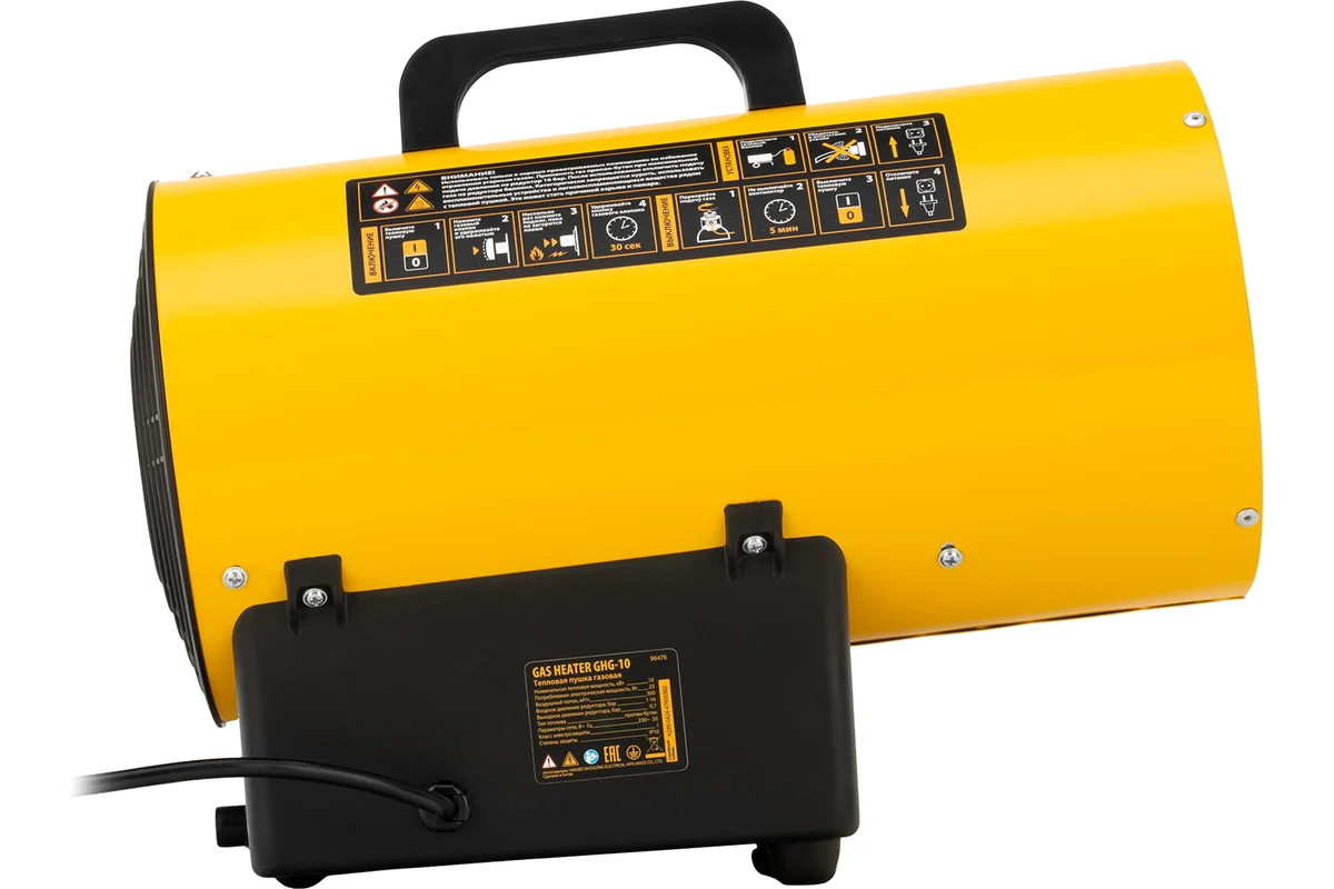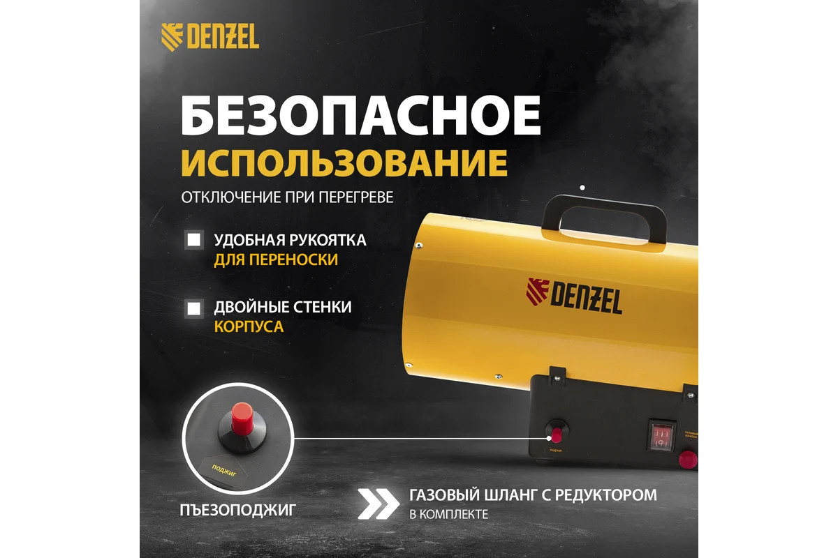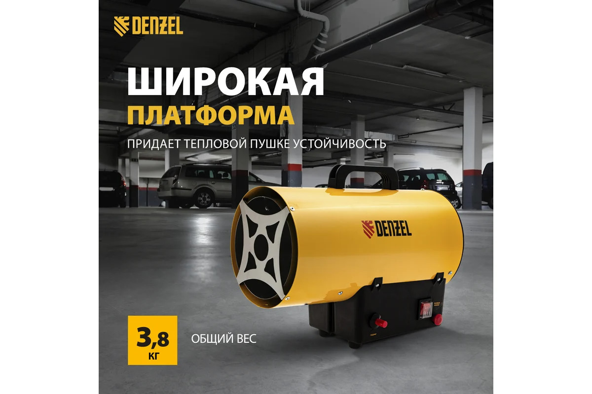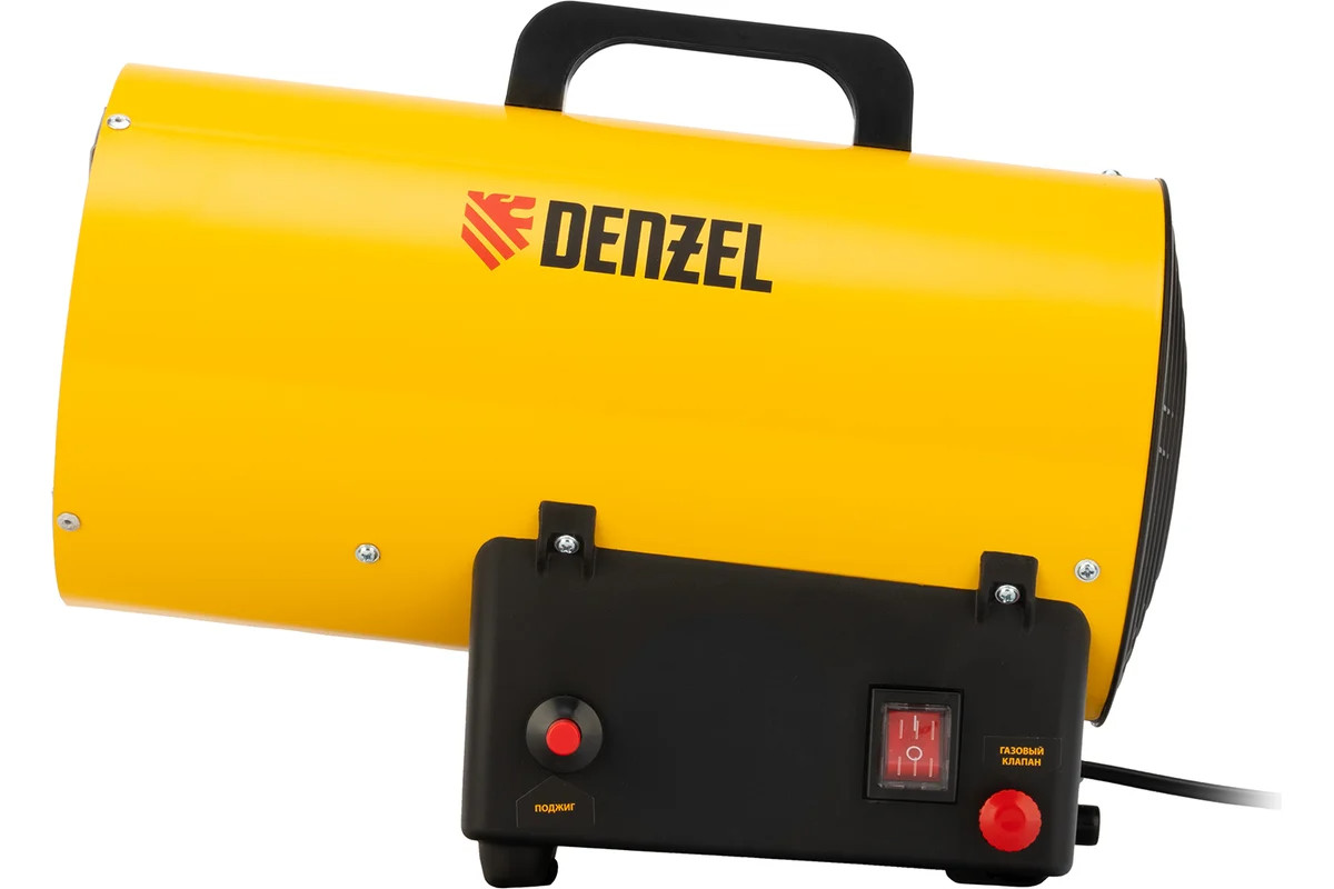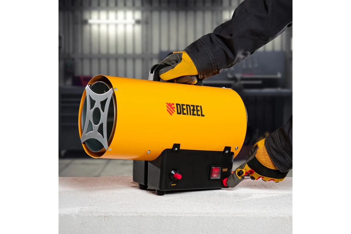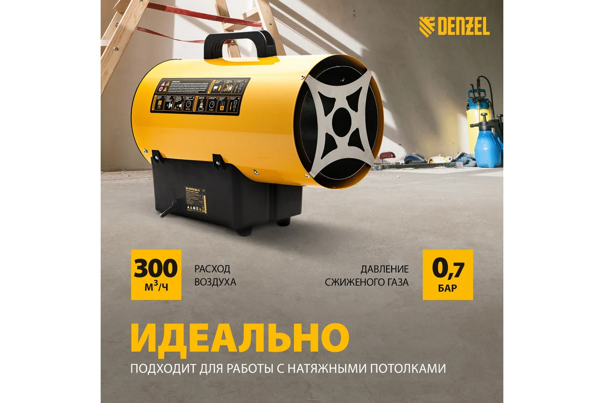 Газовая тепловая пушка Denzel GHG-10, 10 кВт, 300 м3/ч, пропан-бутан 96476 имеет большую тепловую мощность и применяется для работы в мастерских, гаражах, строящихся объектах. Также модель нашла особую популярность при установке натяжных потолков.