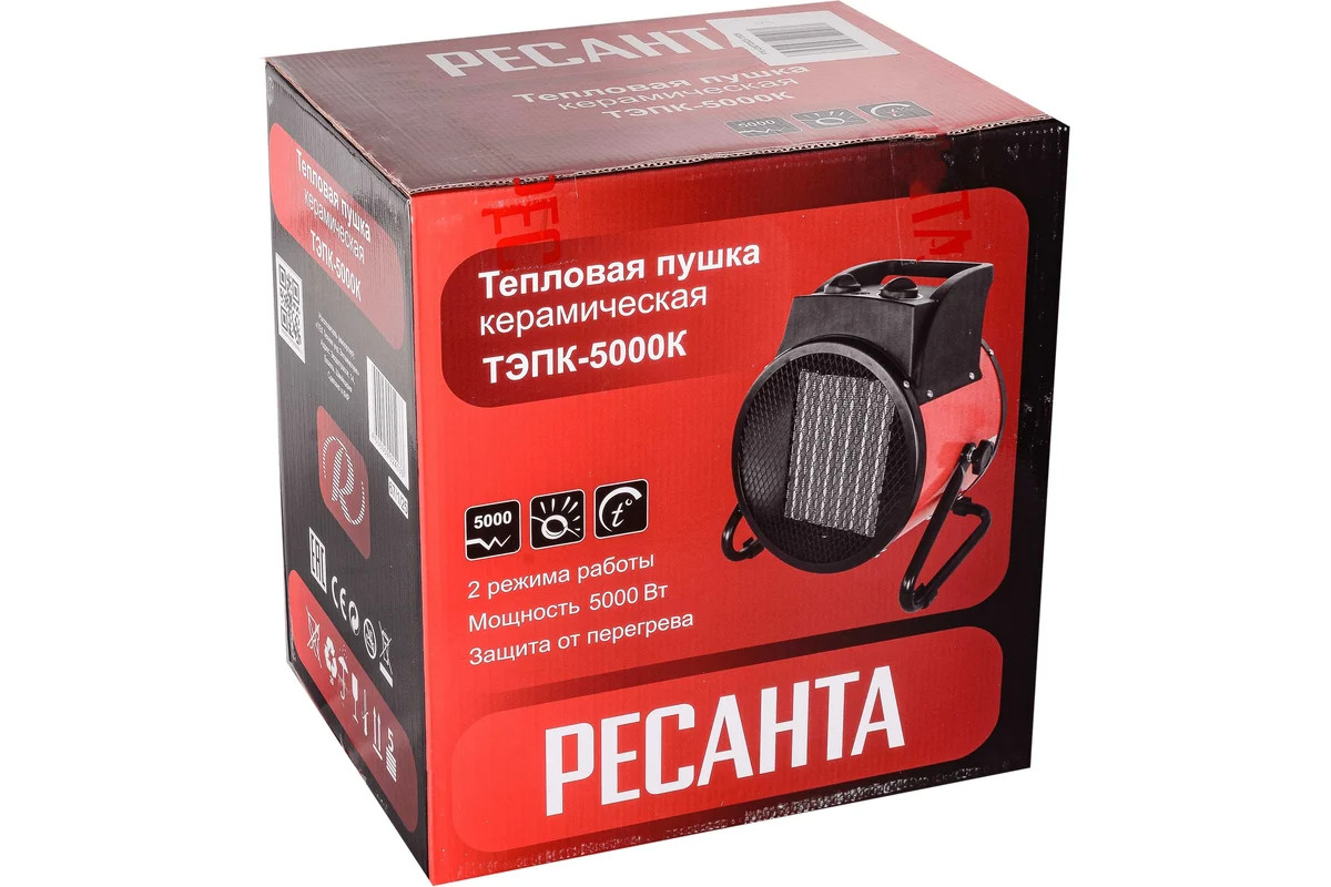 Электрическая теплопушка Ресанта ТЭПК-5000К используется для вентиляции и повышения температуры воздуха в жилых помещениях, на промышленных и строительных площадках. Мощность устройства составляет 5 кВт. Нагревательный элемент из керамики отличается износоустойчивостью. Он непрерывно пропускает через себя потоки воздуха, прогревая их и повышая температуру в помещении.