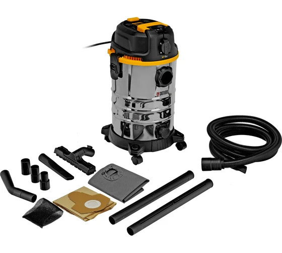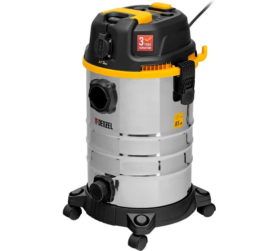 Пылесос строительный Denzel RVC30 28203 мощностью 1400 Вт, с баком объемом 30 л и шлангом длиной 3 м, оснащен розеткой с автосинхронизацией и предназначен для уборки бетонной, кирпичной пыли, опилок, стружки и других твердых отходов. Функция влажной уборки позволяет собирать воду с пола. К пылесосу можно подключить электроинструмент, чтобы минимизировать количество пыли, образующейся в результате пиления, сверления, фрезерования. Техника используется во время проведения строительных и ремонтных работ, будет полезен для поддержания чистоты в мастерской, гараже, производственном помещении.