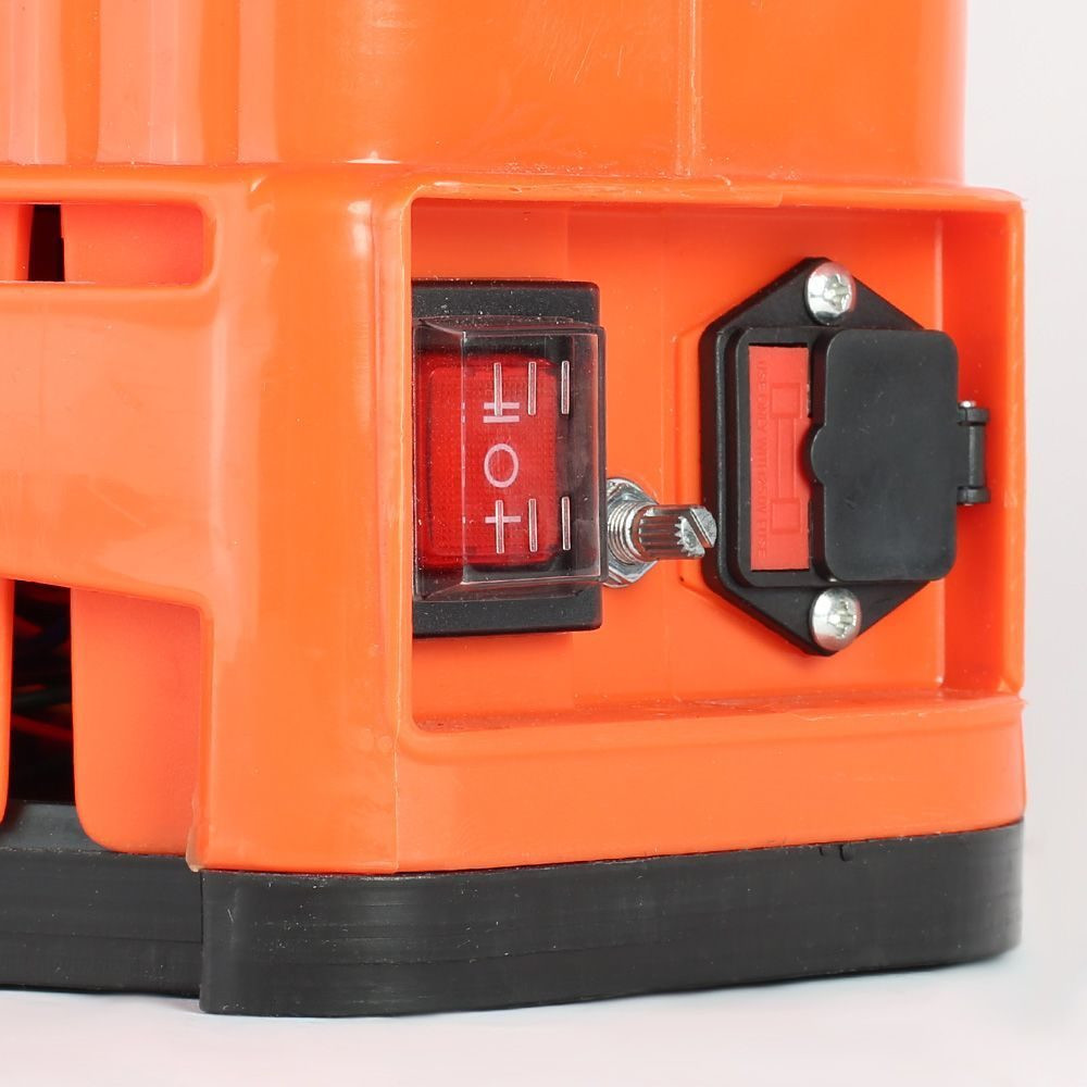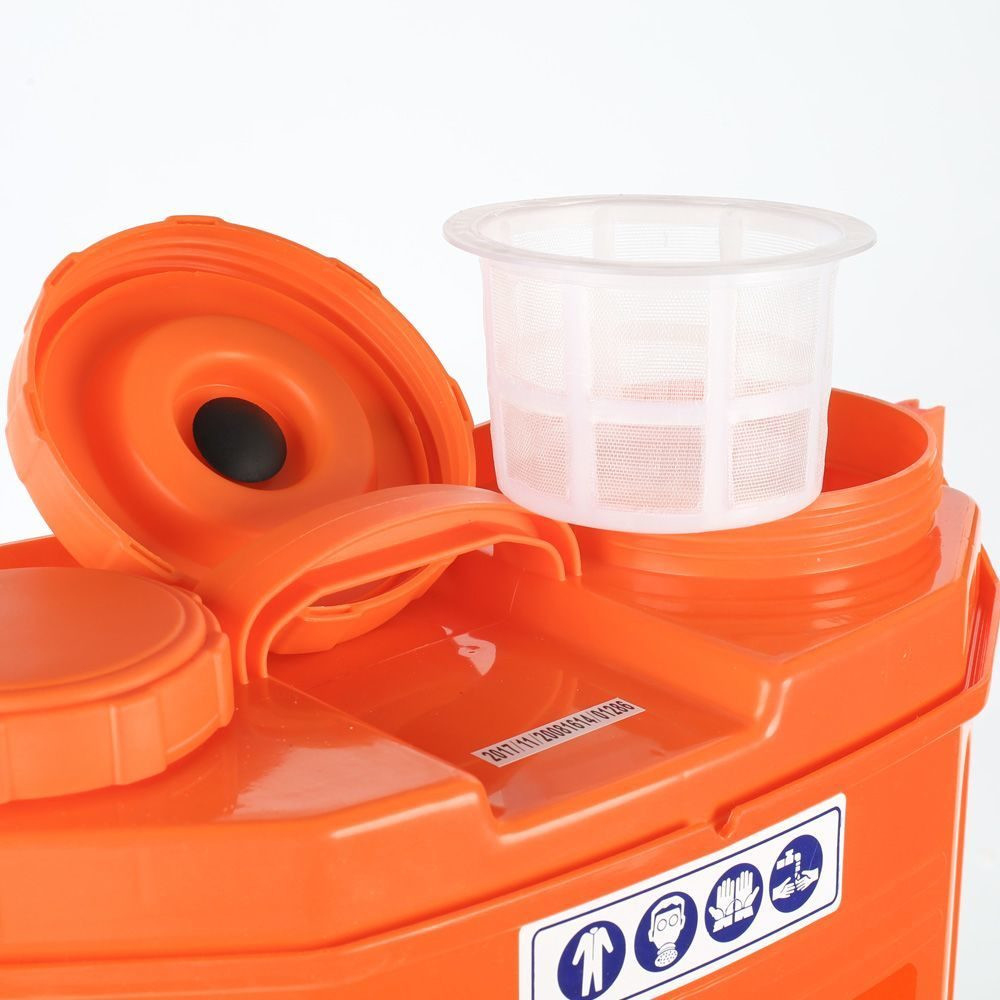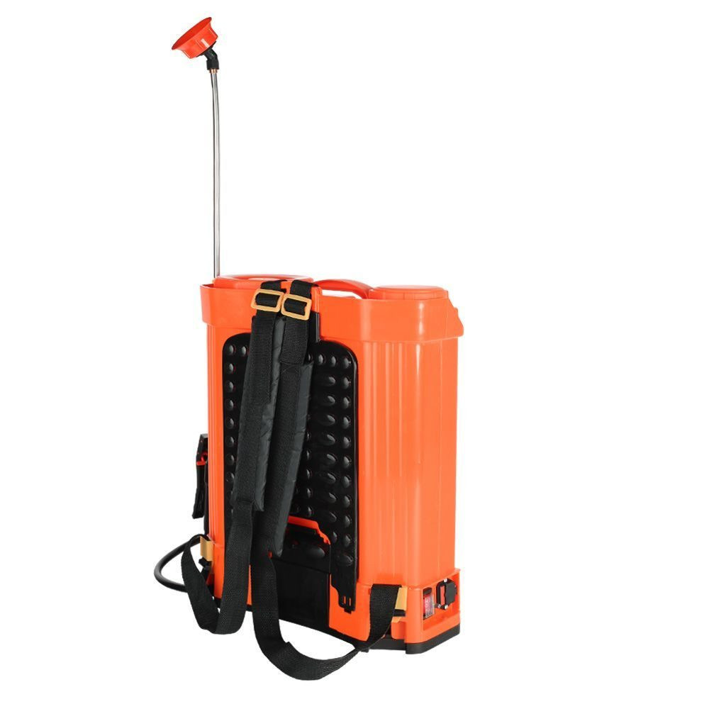Отличный ранцевый распылитель, прост в использовании. В комплекте резервуар, лямки на плечи, аккумулятор съемный, 2 фильтр сеточки, шланг, телескопический удлинитель, 4 насадки, заточные прокладки, зарядное устройство, подключается к самому ранцу. Шланг выходит из ранца справа сбоку, левшам не очень удобно. Хороший насос всегда держит рабочее давление, распыляет хорошо дерево около 3 метров достаёт до верхушки. В самом ранце есть маленький пенал для хранения насадок и прочей мелочевки. После работы можно весь комплект сложить внутрь ранца, в резервуар для жидкости. Сверху удобная ручка для переноски