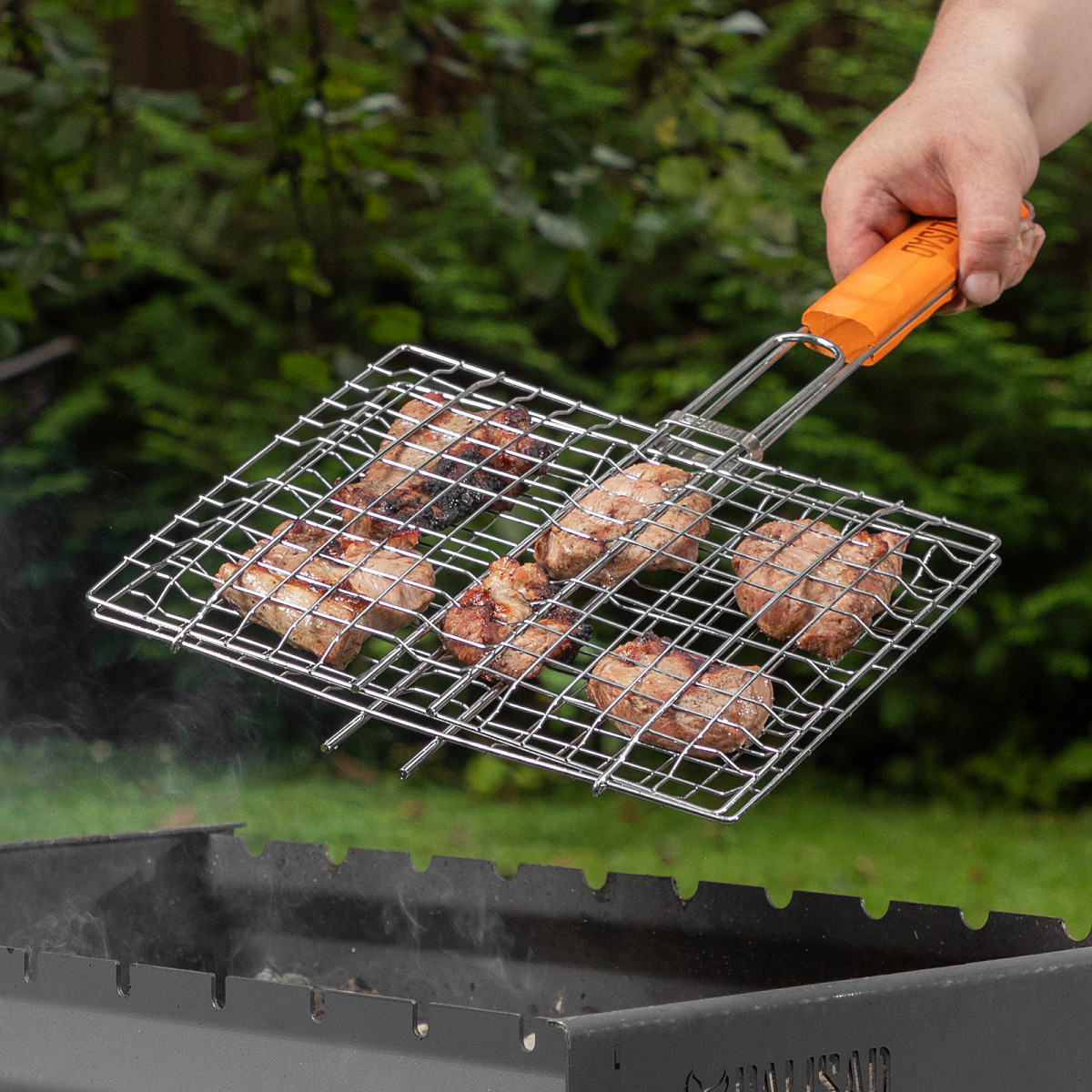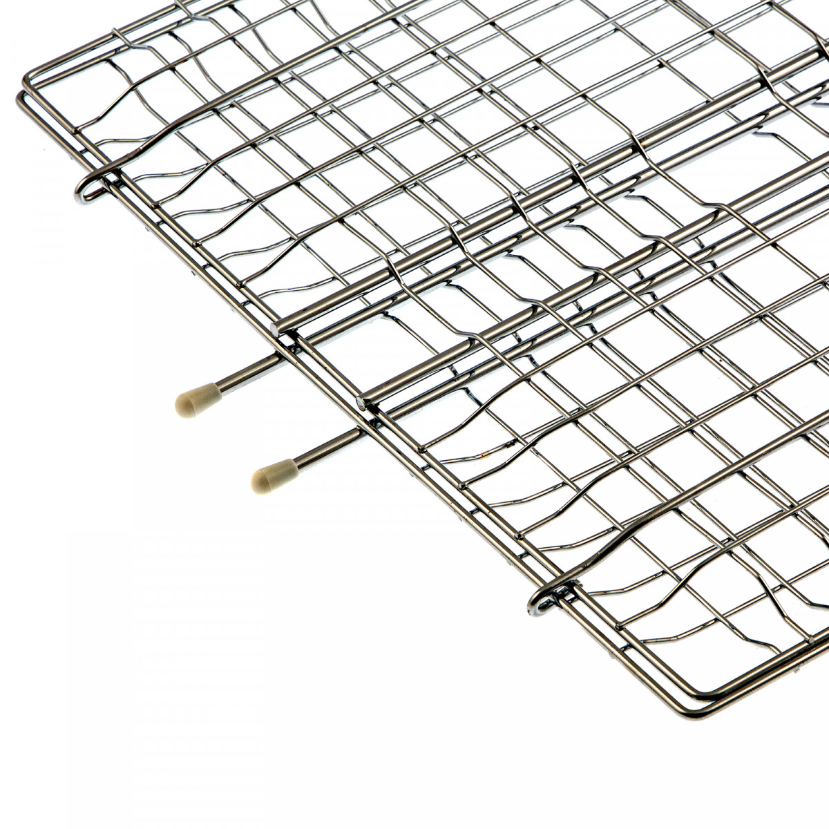 - Решетка оборудована увеличенными опорными стержнями, за счет чего прочно фиксируется на мангале, а при готовке ее площадь используется полностью.