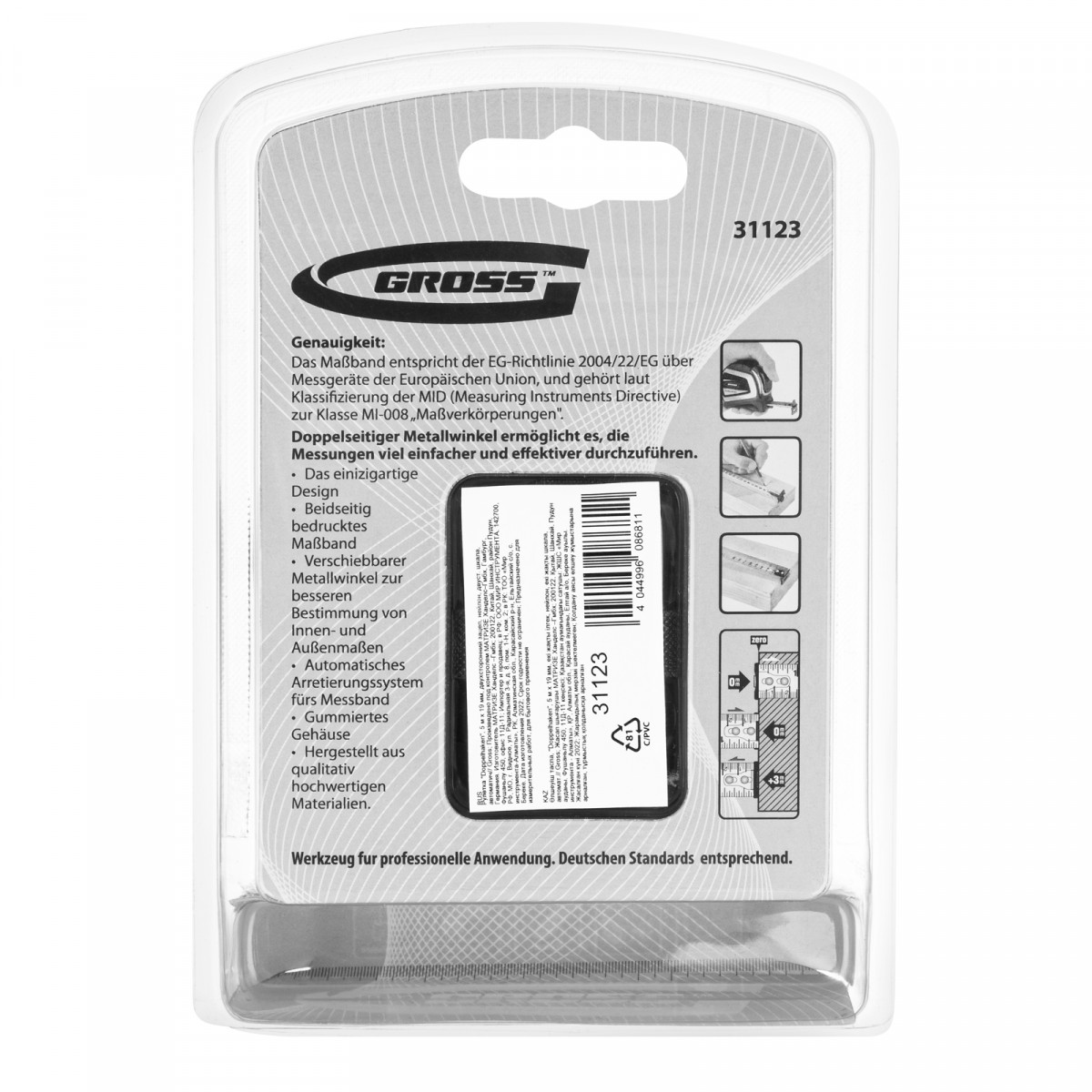 Автоматическая рулетка Gross «Doppelhaken» 31123 с односторонним зацепом, лентой 5 м x 19 мм, двухсторонней шкалой и нейлоновым покрытием, пригодится в хозяйстве и на строительной площадке. С ее помощью можно осуществить замеры стен, полов, различных материалов и конструкций.