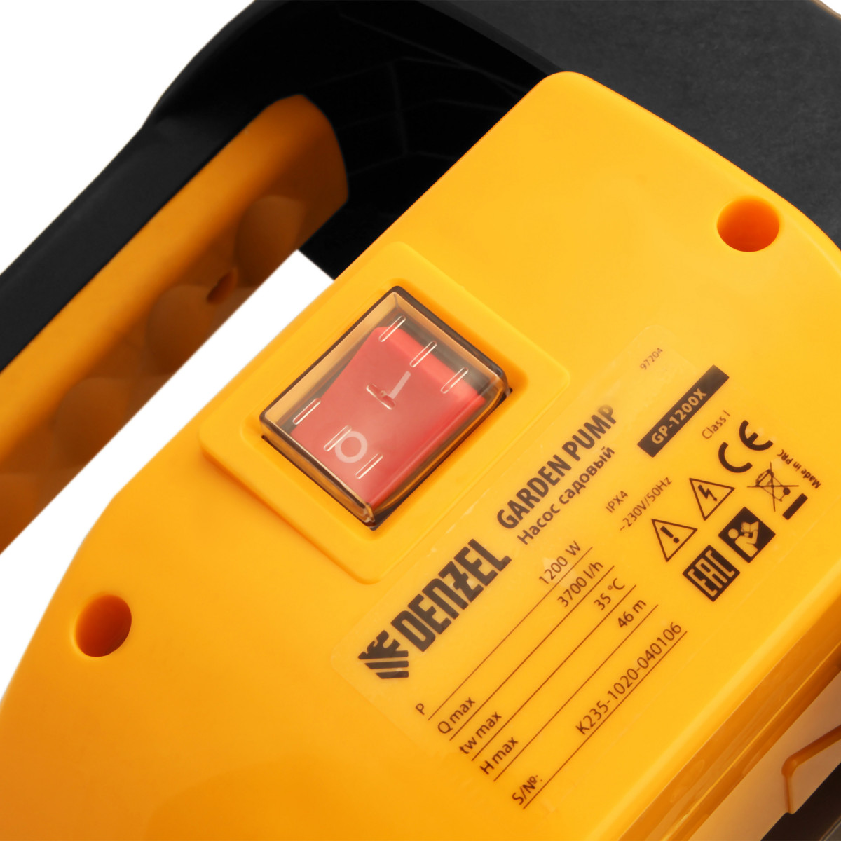 Садовый поверхностный насос Denzel GP1200X 97204 с корпусом насосной части из «нержавейки», мощностью 1200 Вт и производительностью 3700 л/ч, способен забирать чистую воду с глубины до 8 м из колодцев, емкостей и водоемов и подавать ее на высоту до 46 м. Обеспечивает стабильный напор и используется для организации системы полива и водоснабжения на даче. Производительности хватает для одновременного снабжения нескольких водоразборных точек.