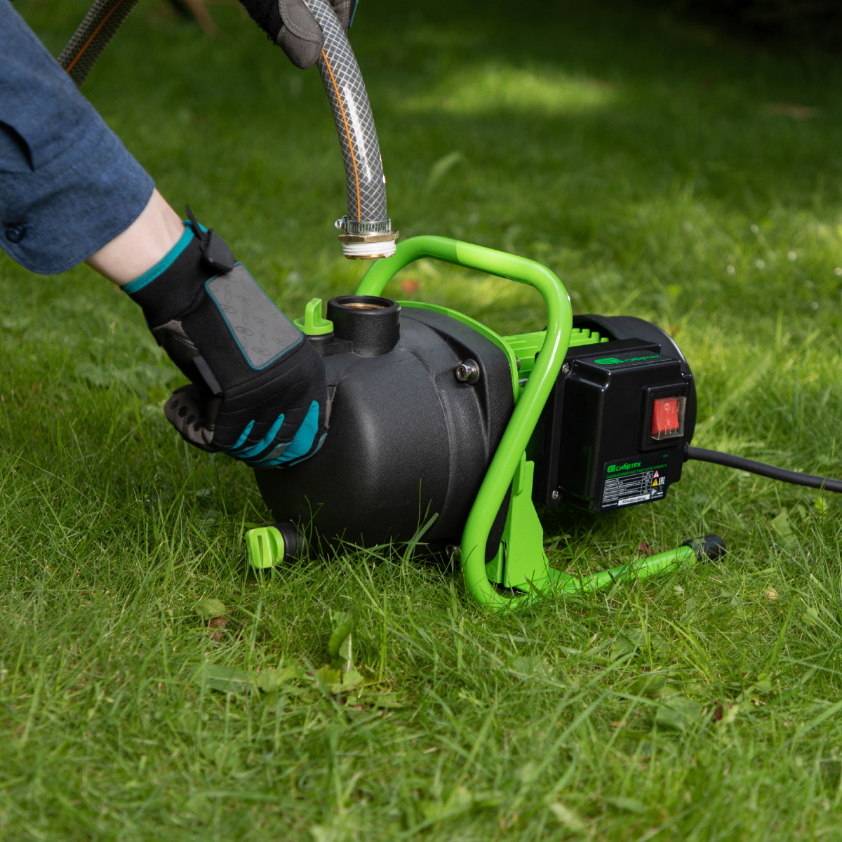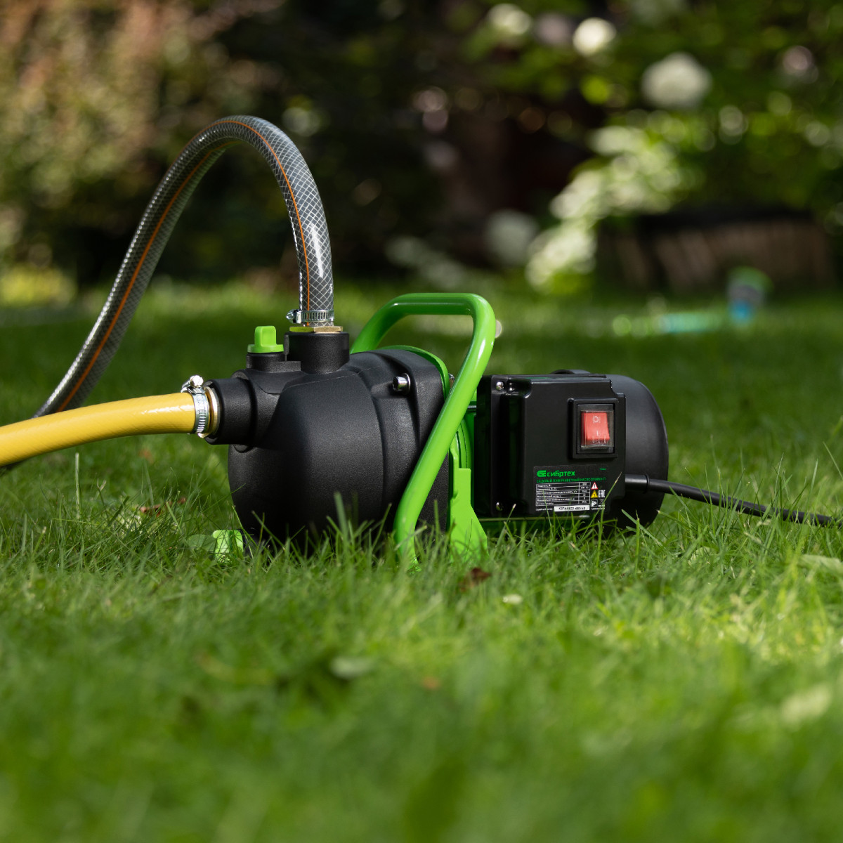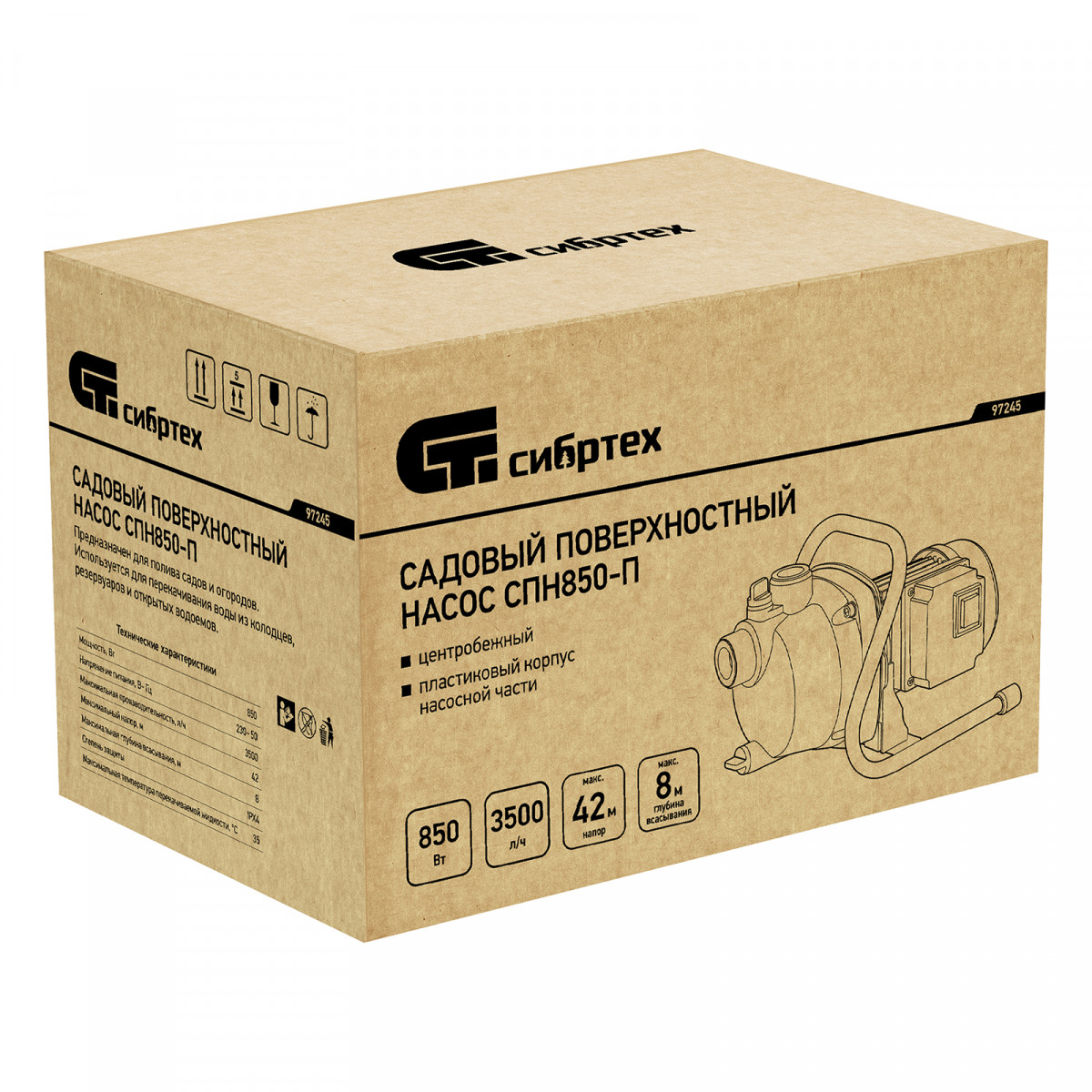 Садовый поверхностный насос Сибртех СПН850-П 97245 мощностью 850 Вт и производительностью 3500 л/ч, с корпусом насосной части из пластика, может забирать воду с глубины до 8 м из колодцев, водоемов и накопительных емкостей, создавая напор до 42 м. Используется для подачи воды на кухню, в душ или баню загородного дома, легко справляется с подачей воды на верхние этажи. Применяется также в системах орошения.