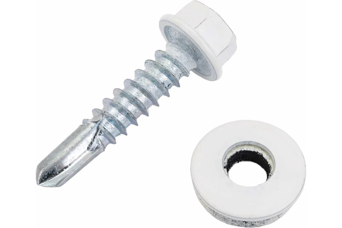 Используется при монтаже профнастила и металлочерепицы к конструкциям из металла или древесины. Имеет шестигранную головку с шайбой и прокладку EPDM из синтетического каучука.