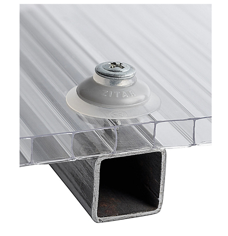 Шайба термоизоляционная - предназначена для крепления листов поликарбоната к различным основаниям. Состоит из металлической шайбы и специальной резиновой (EPDM) прокладки. Обеспечивает герметичность соединения и возможность температурного расширения поликарбоната. Термошайбы исключают теплопотери и возможность протечек. Их размер универсален для крепления поликарбонатных панелей любой толщины. При соблюдении всех условий монтажа, крепление термошайбами гарантирует сохранение конструкции в надлежащем виде в течение всего срока эксплуатации поликарбонатных панелей. Можно использовать саморезы для металла или дерева диаметром 4,8 - 6,3 мм. Если речь идет о металле, то лучше и удобнее использовать саморезы с шляпкой под шестигранный ключ и буром на конце.