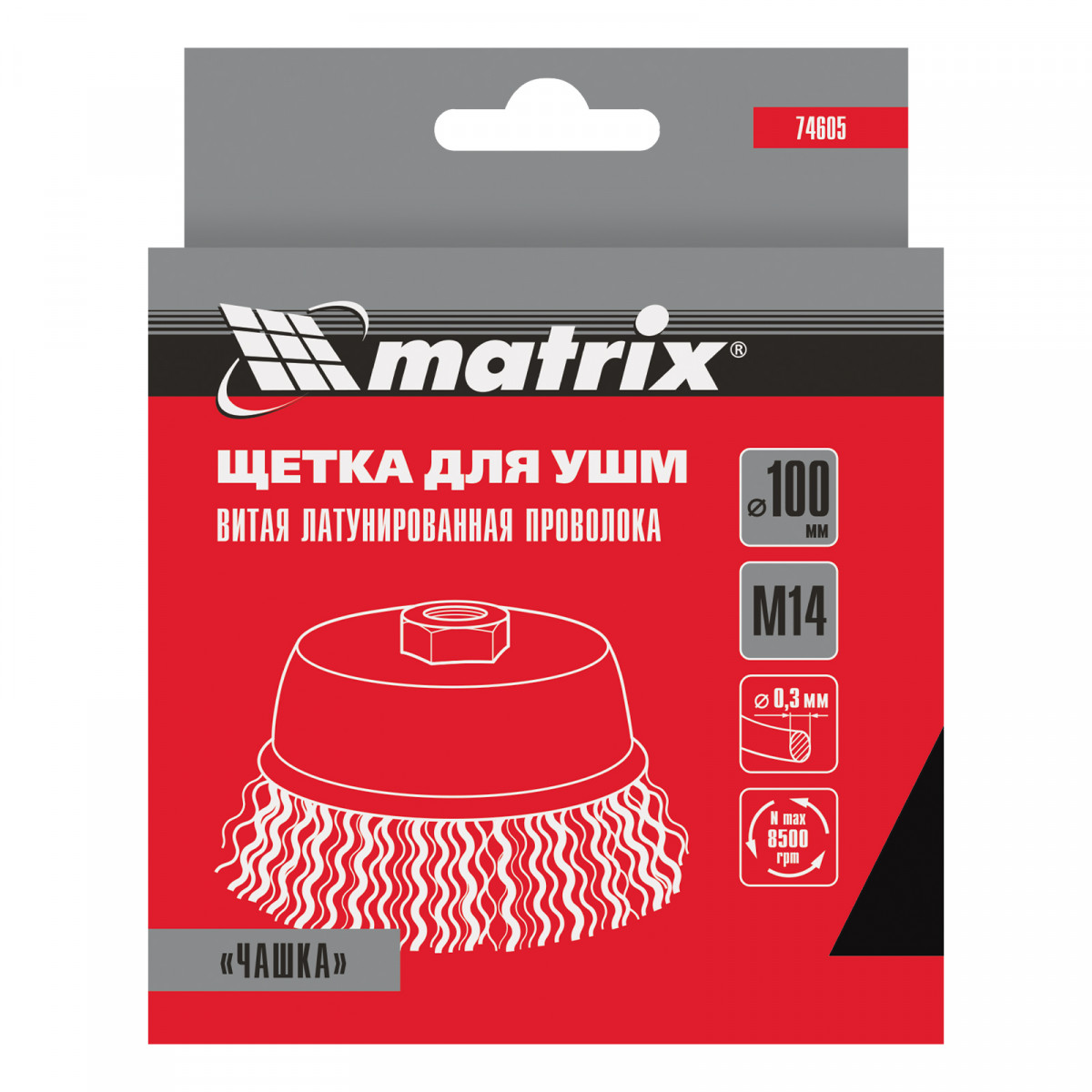 Щетка «чашка» Matrix 74605 диаметром 100 мм, с щетиной из латунированной витой проволоки, устанавливается на вал УШМ с помощью гайки М14. Предназначена для снятия тонкого слоя краски или лака, удаления ржавчины и загрязнений. При рекомендованной скорости вращения 8500 об/мин щеткой можно быстро обрабатывать участки большой площади.