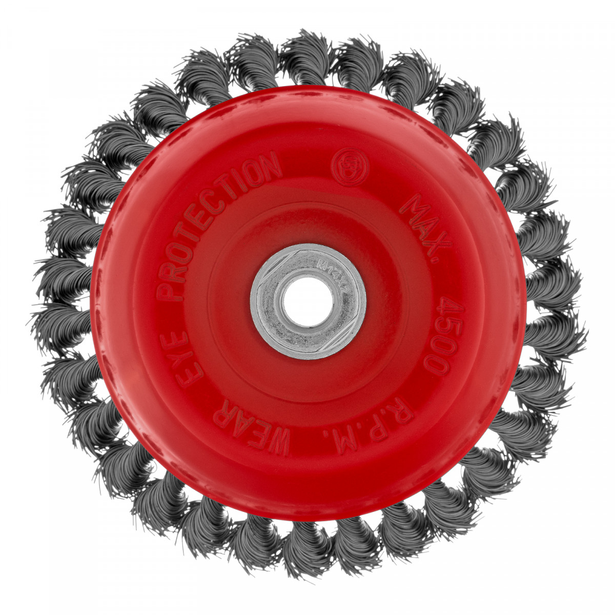 Щетка Matrix «Чашка» 74629 диаметром 150 мм, с присоединительной резьбой М14, с щетиной из крученой проволоки диаметром 0,5 мм, устанавливается на УШМ, поддерживающую работу со скоростью 4500 об/мин. Изделие предназначено для грубой (черновой) обработки поверхностей и подходит для удаления загрязнений, снятия толстого слоя ржавчины, ЛКМ, зачистки сварных швов.
