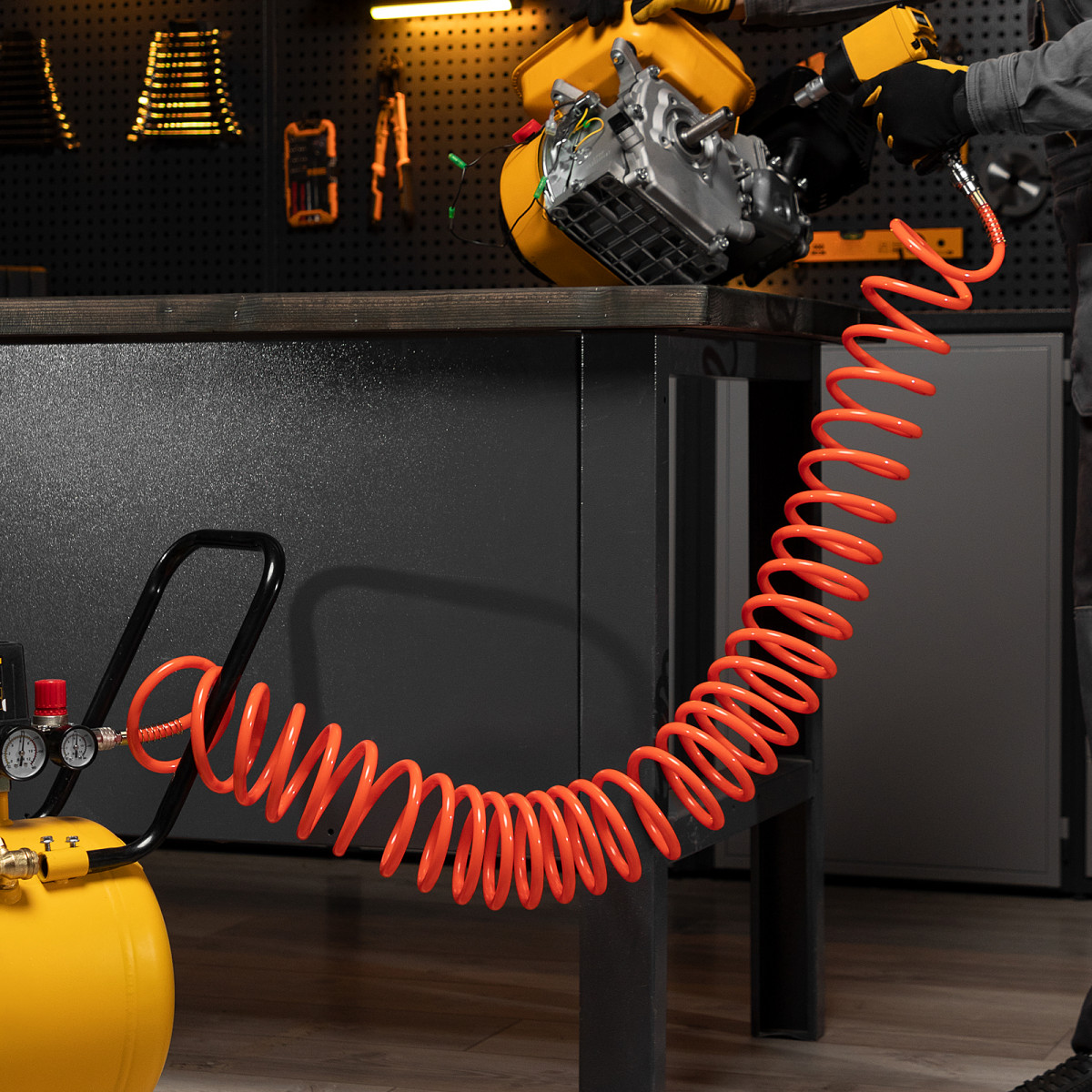 - Спиральная форма — шланг удобен в хранении, а во время работы не мешает передвижению.