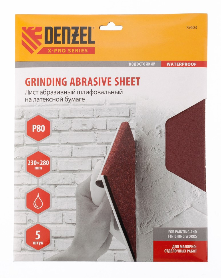 Шлифлист на бумажной основе P 80, 230 х 280 мм 5 шт латексный водостойкий Denzel