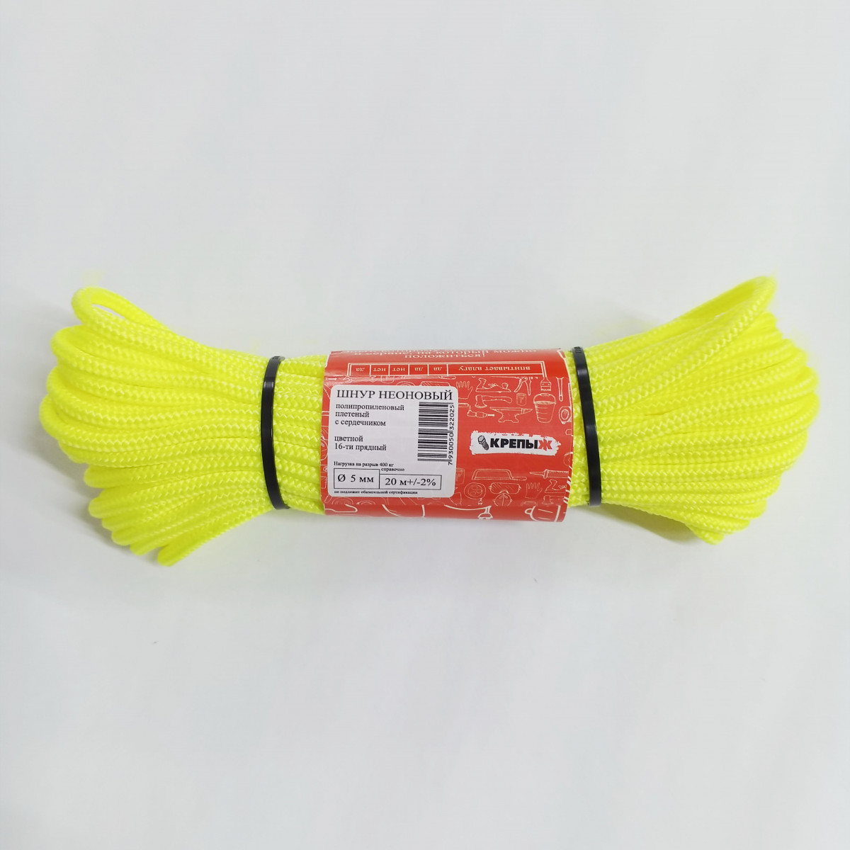 Шнур полипропиленовый плетёный 5 мм 16 пр. с сердечником НЕОНОВЫЙ-желтый (20м) КРЕПЫЖ