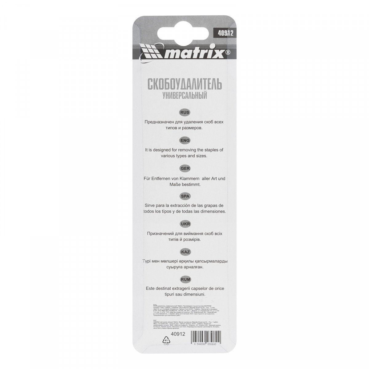 Универсальный скобоудалитель Matrix 40912 быстро и аккуратно удаляет ненужные скобы. Является необходимым дополнением к степлеру и значительно упрощает выполнение работ большого объема. Подходит для профессионального и бытового использования.