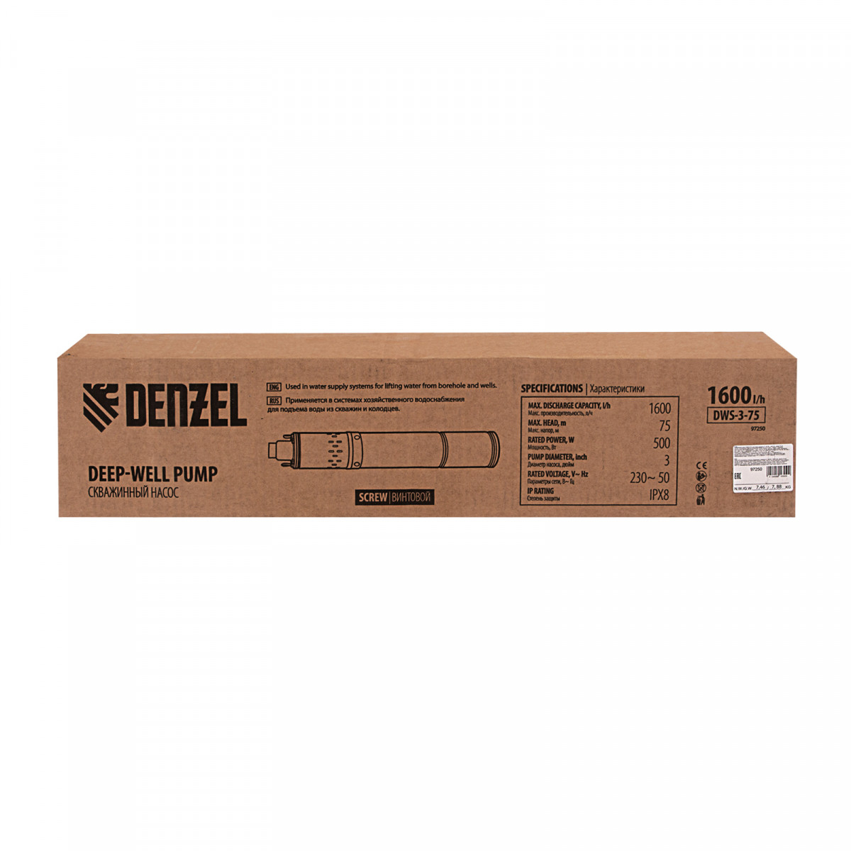 Скважинный насос DWS-3-75, винтовой, диаметр 3", 500 Вт, 1600 л/ч, напор 75 м Denzel