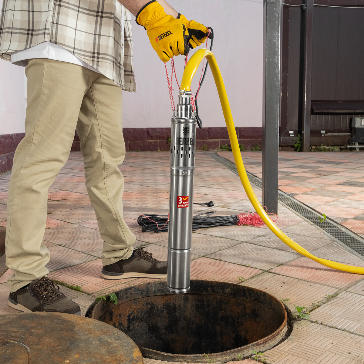 - Простая установка — необходимо закрепить трос в проушинах, опустить насос в вертикальном положении в воду и зафиксировать трос над колодцем или скважиной.