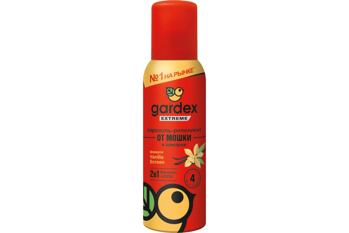 Аэрозоль-репеллент от мошки и комаров GARDEX Extreme 100 мл 0151 содержит инновационную формулу Vanilla Screen: действующее вещество средства усилено ванилином, который является природным веществом, отпугивающим мошек. Это позволяет аэрозолю обеспечивать надежную защиту от мошки, комаров, мокрецов, слепней, москитов.Средство от комаров и мошки действует до 4 часов после нанесения на открытые участки кожи и до 20 суток при нанесении на одежду или снаряжение из натуральных тканей. Аэрозоль также можно использовать для обработки детской одежды.Аэрозоль от комаров и мошки позволит забыть о назойливых кровососущих насекомых и сделает отдых комфортным.