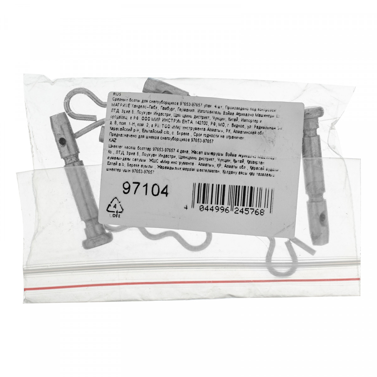 Срезные болты 97104 предназначены для снегоуборочных машин SBM 610 97653, SBM 610S PRO 97654, SBL 711D PRO 97655, SBL 711DT PRO 97656, BM 610DT PRO 97657. Играют ключевую роль в соединении уборочного шнека с приводным валом, что существенно увеличивает срок используемой техники.,Внимание — использование обыкновенных болтов вместо срезных грозит поломкой шнека снегоуборщика!