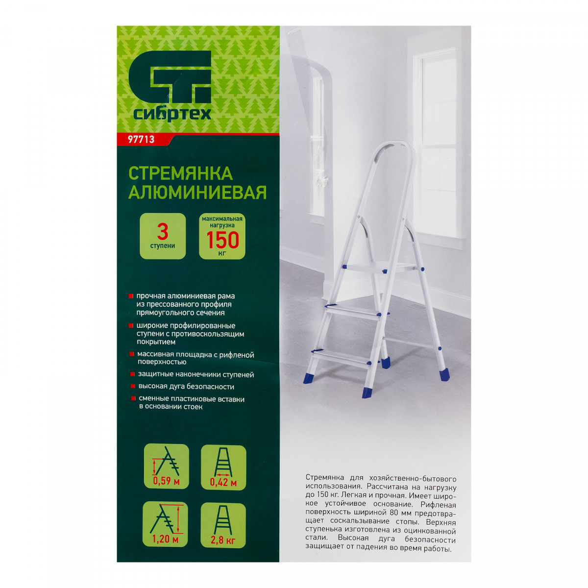 Стремянка алюминиевая Сибртех 97713 с 3 ступенями предназначена для выполнения работ на высоте, превышающей человеческий рост. Высокая дуга безопасности обеспечивает устойчивое положение пользователя. Площадка находится на высоте 59,7 см от опорной поверхности, рабочая высота стремянки составляет 259,7 см (при среднем росте пользователя 170 см). Стремянка пригодится во время строительных и ремонтных работ, позволит без лишних усилий повесить картину или шторы, покрасить стену, достать нужную вещь с антресолей или верхней полки шкафа, а также решить много других бытовых задач.