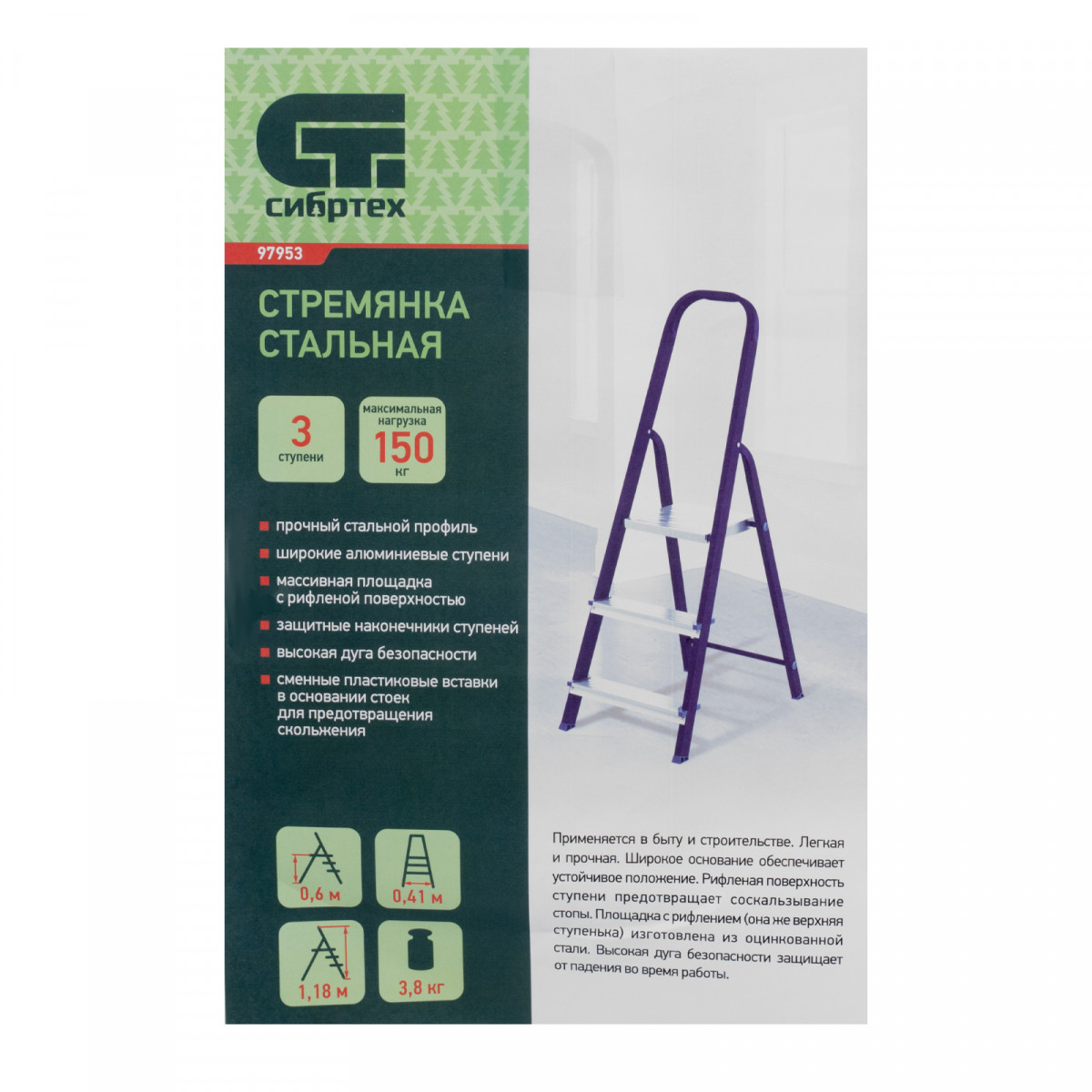 Стремянка Сибртех 97953 со стальным профилем и 3 ступенями, 2 из которых алюминиевые, упрощает доступ к предметам, расположенным на антресолях, шкафах, высоких полках. Также будет полезна для проведения отделочных и монтажных работ. Лестница обладает высокой прочностью при весе 4,4 кг и выдерживает нагрузку до 150 кг. Площадка находится на высоте 57,6 см от опорной поверхности, рабочая высота стремянки составляет 257,6 см (при среднем росте пользователя 170 см).