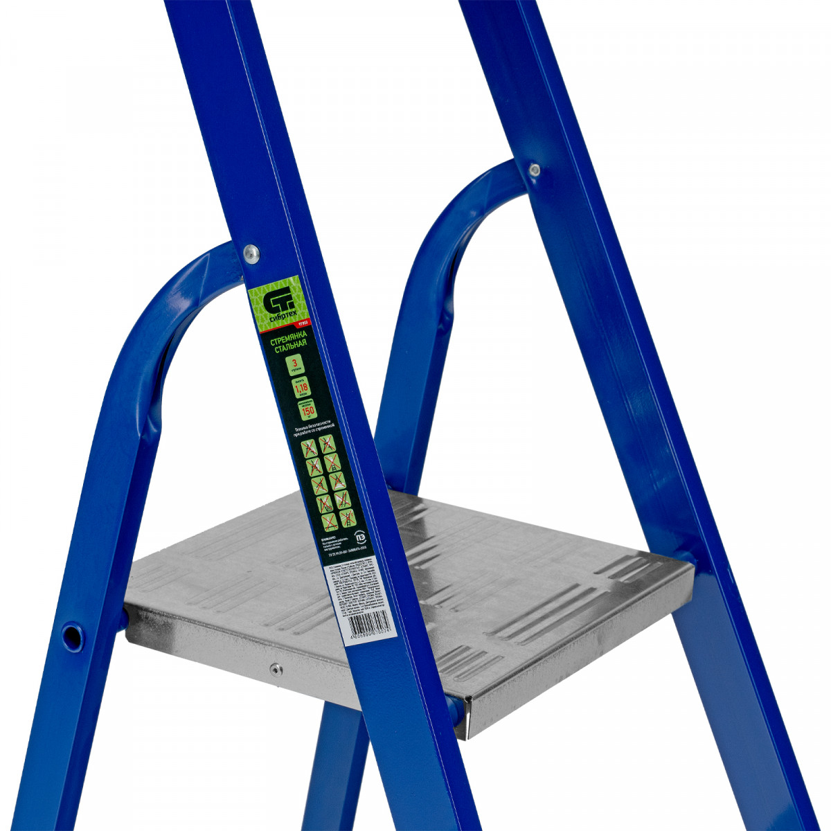 • Надежная конструкция — рама изготовлена из профилированной стали, стальная верхняя площадка с зацепами прочно фиксирует стремянку в рабочем положении.