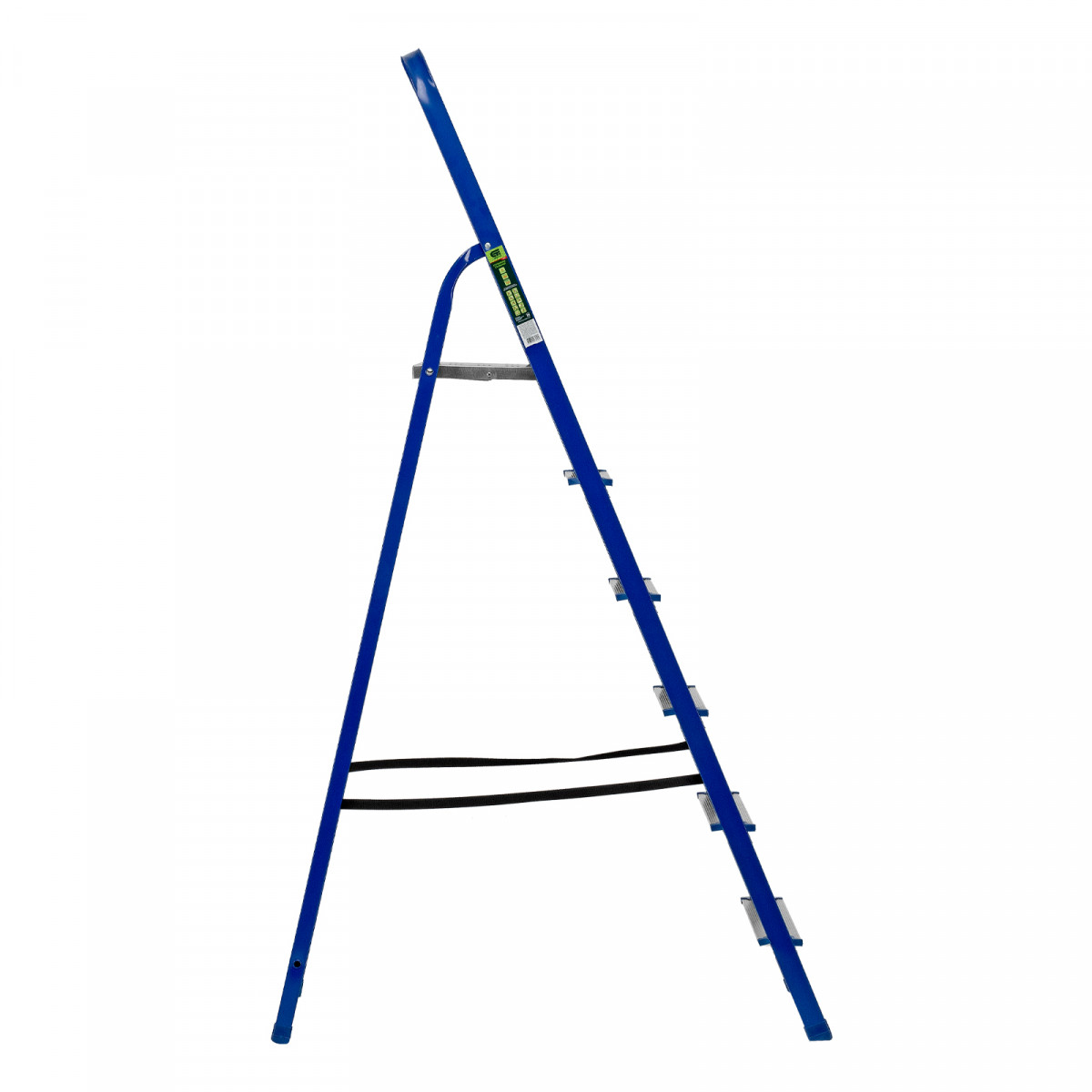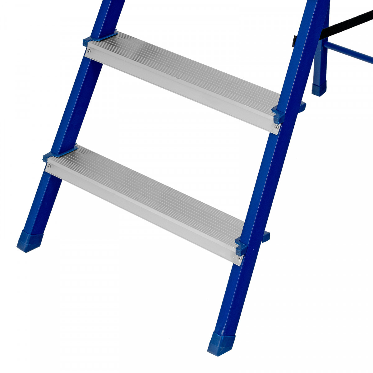 • Надежность — рама изготовлена из профилированной стали, стальная верхняя площадка с зацепами прочно фиксирует стремянку в рабочем положении, страховочные ленты придают дополнительную прочность конструкции.