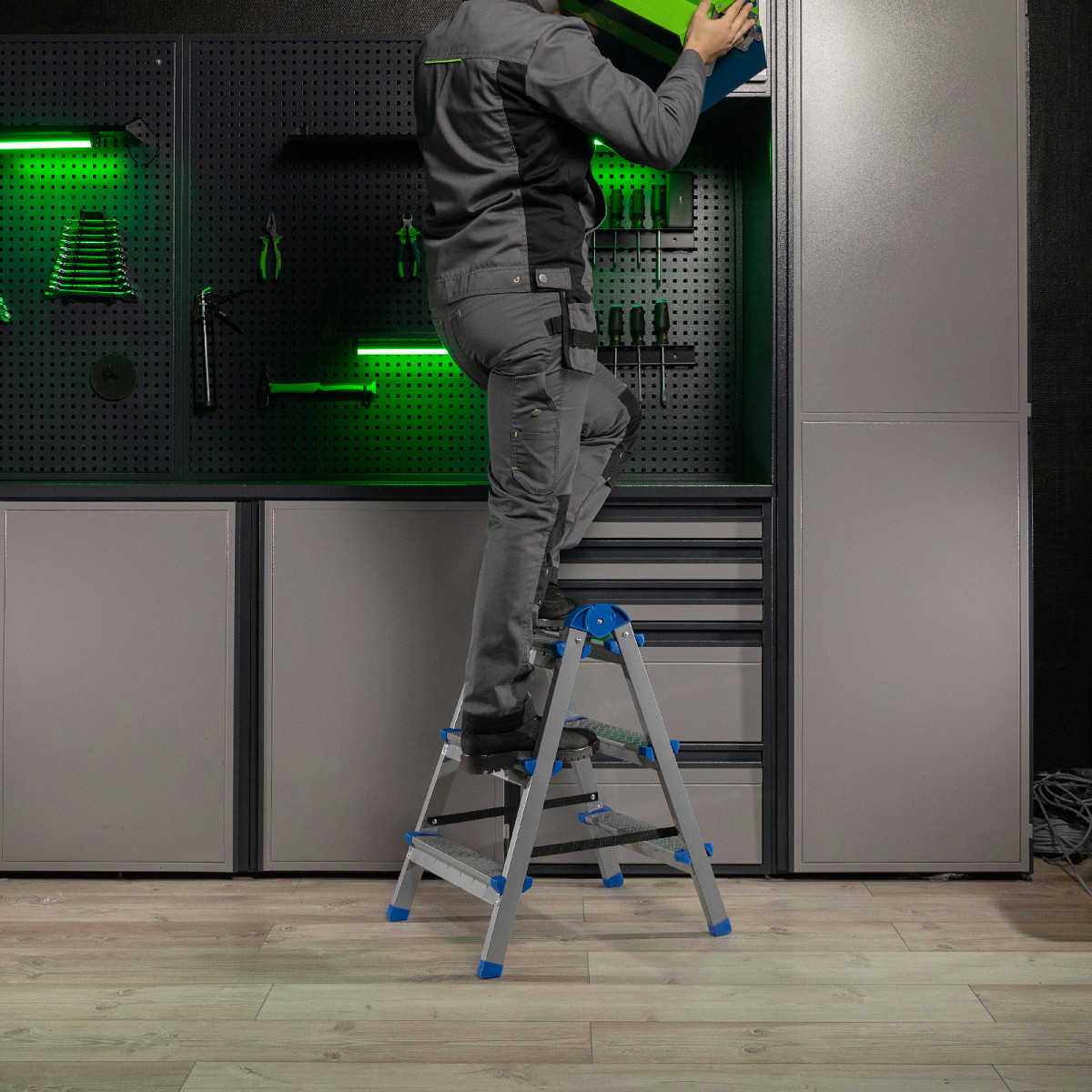 • Безопасность пользователя — на рифленых широких ступенях ступни не скользят, на углах имеются пластиковые наконечники для защиты от травм.