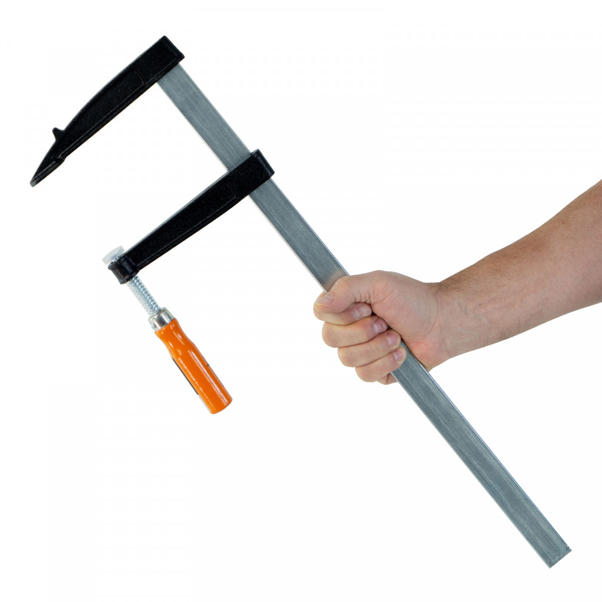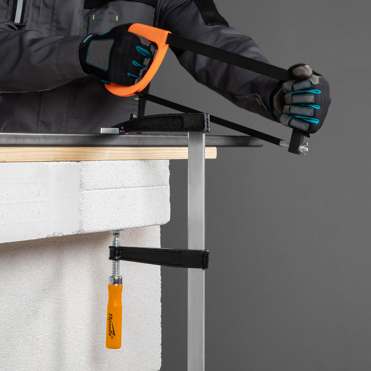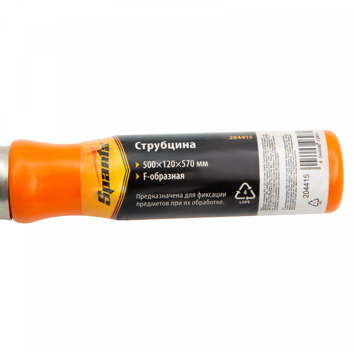 F-образная струбцина Sparta 204415, 500 х 120 х 570 мм, используется в столярном и слесарном деле и позволяет фиксировать заготовки из металла, древесины и других материалов для их соединения или обработки. Деталь помещают между губками, одна из которых подвижна и служит для регулировки величины захвата. Винтовой зажим позволяет прикладывать значительное усилие для надежной фиксации. Защитные накладки предотвращают повреждение детали. Элементы конструкции выдерживают высокую температуру, поэтому струбцина подходит для проведения сварочных работ, при этом пластиковые накладки необходимо снять.