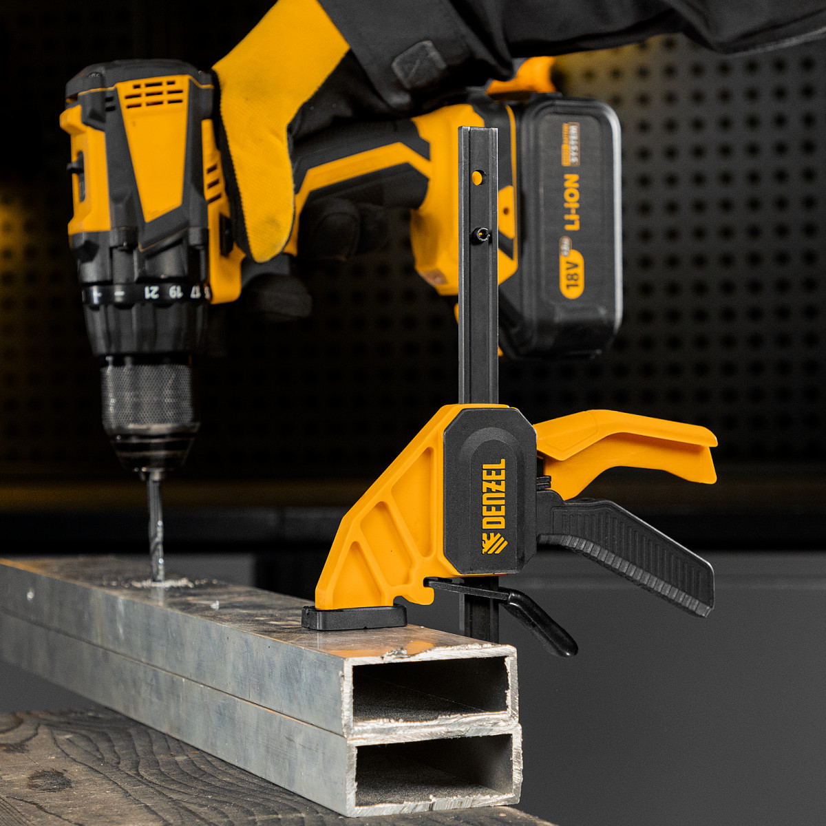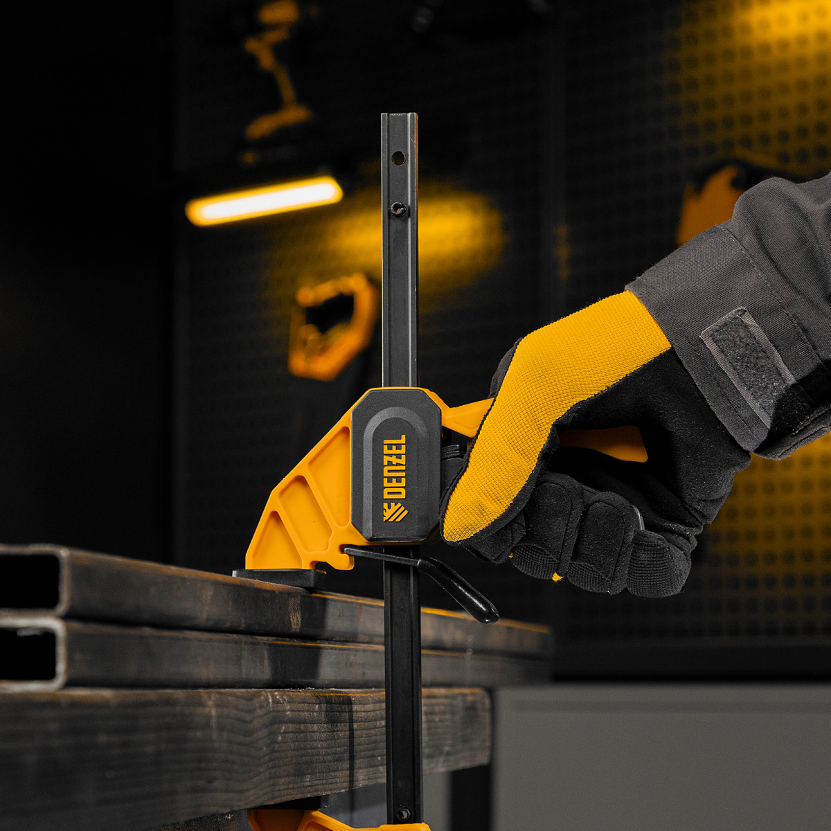 • Комфортное использование — струбцина весит всего 290 г, обрезиненная кнопка фиксации обеспечивает удобный захват.