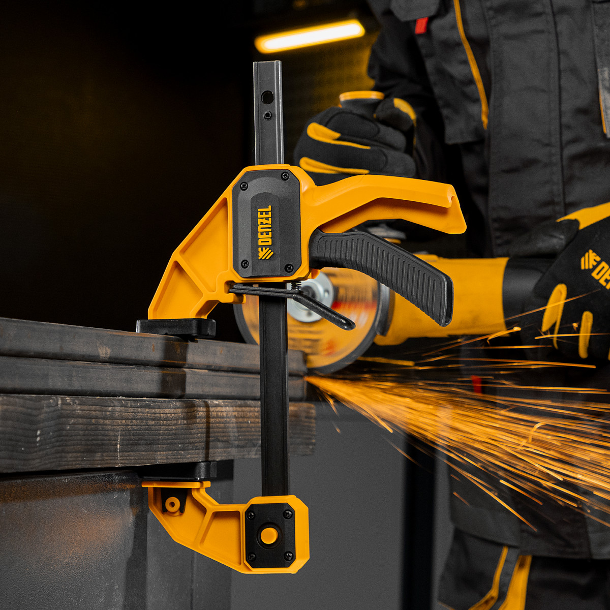 • Комфортное использование — струбцина весит всего 560 г, обрезиненная кнопка фиксации обеспечивает удобный захват.
