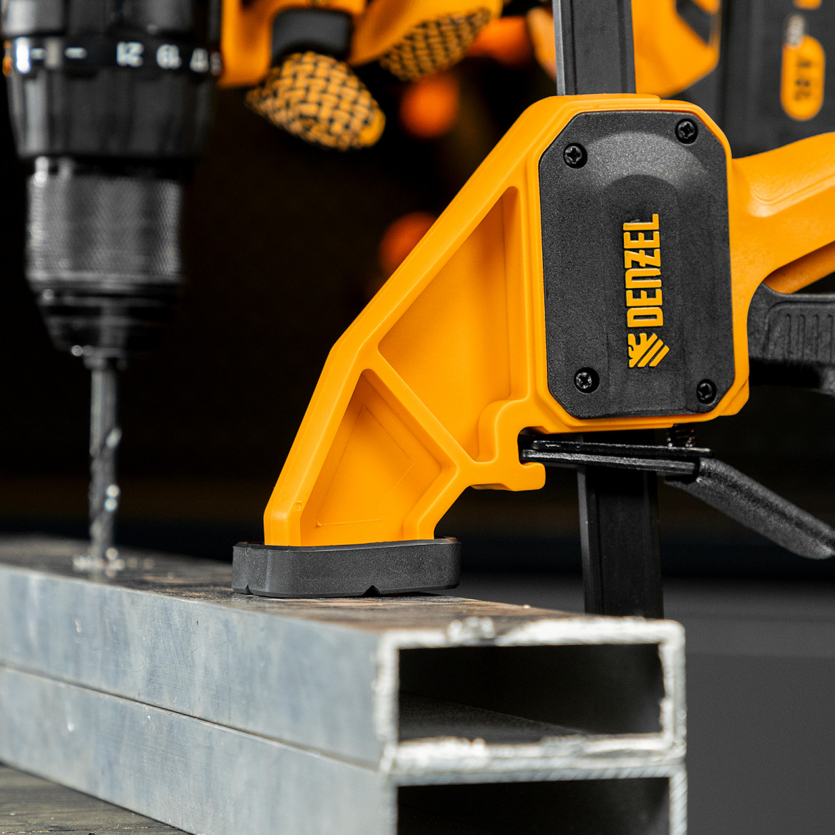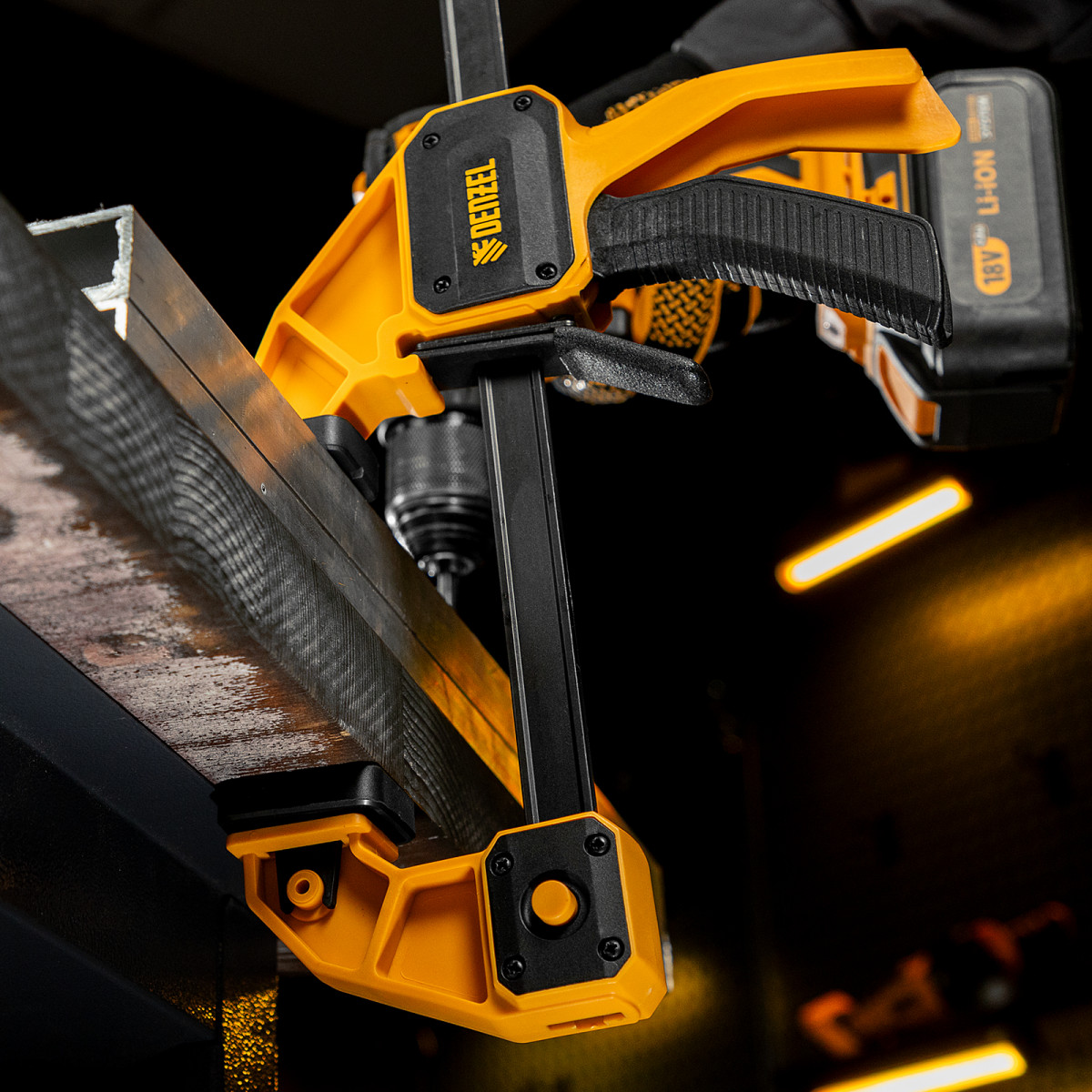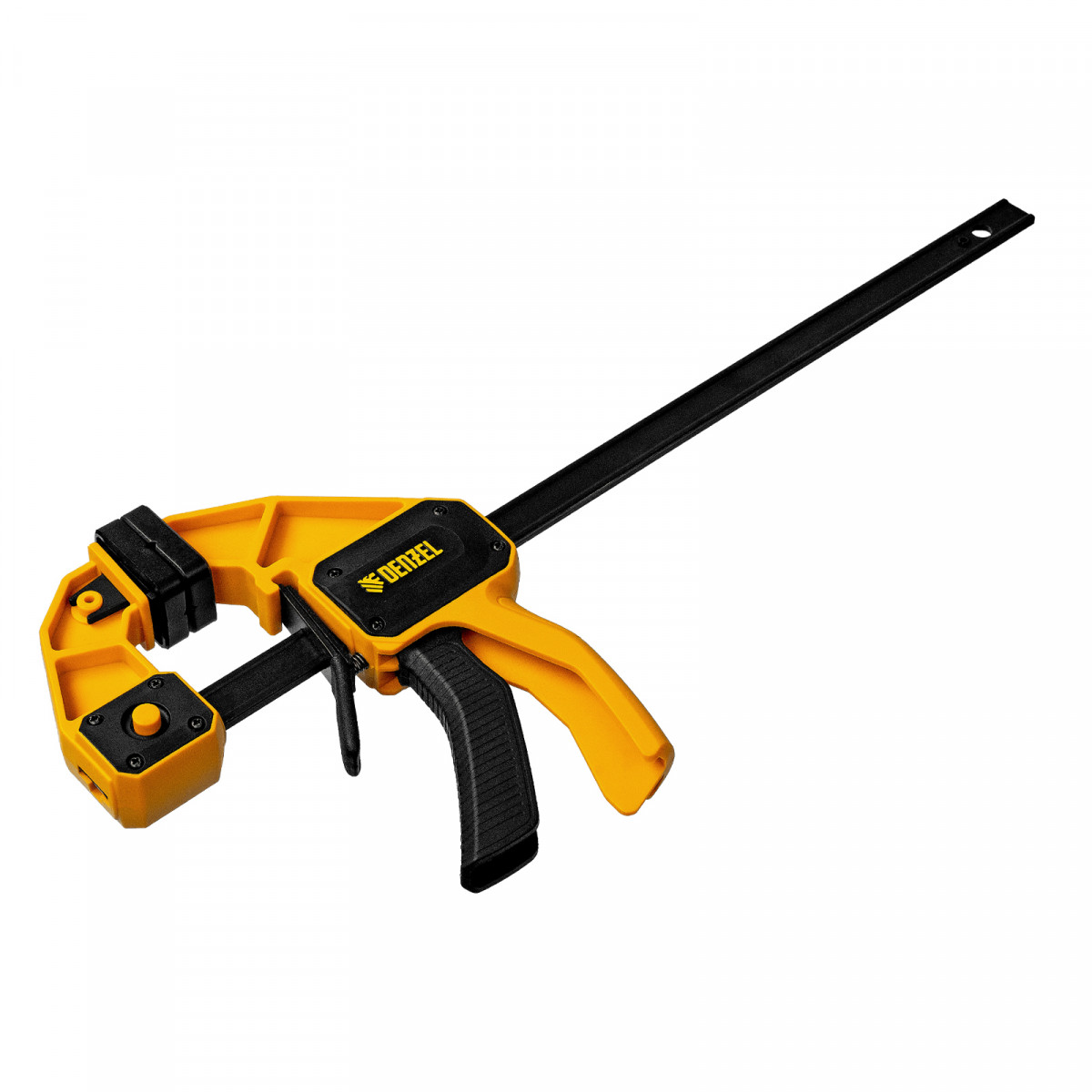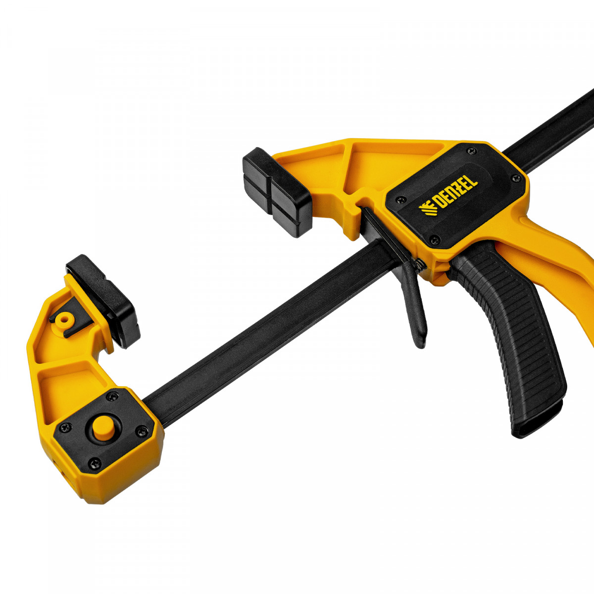 • Комфортное использование — струбцина весит всего 620 г, обрезиненная кнопка фиксации обеспечивает удобный захват.