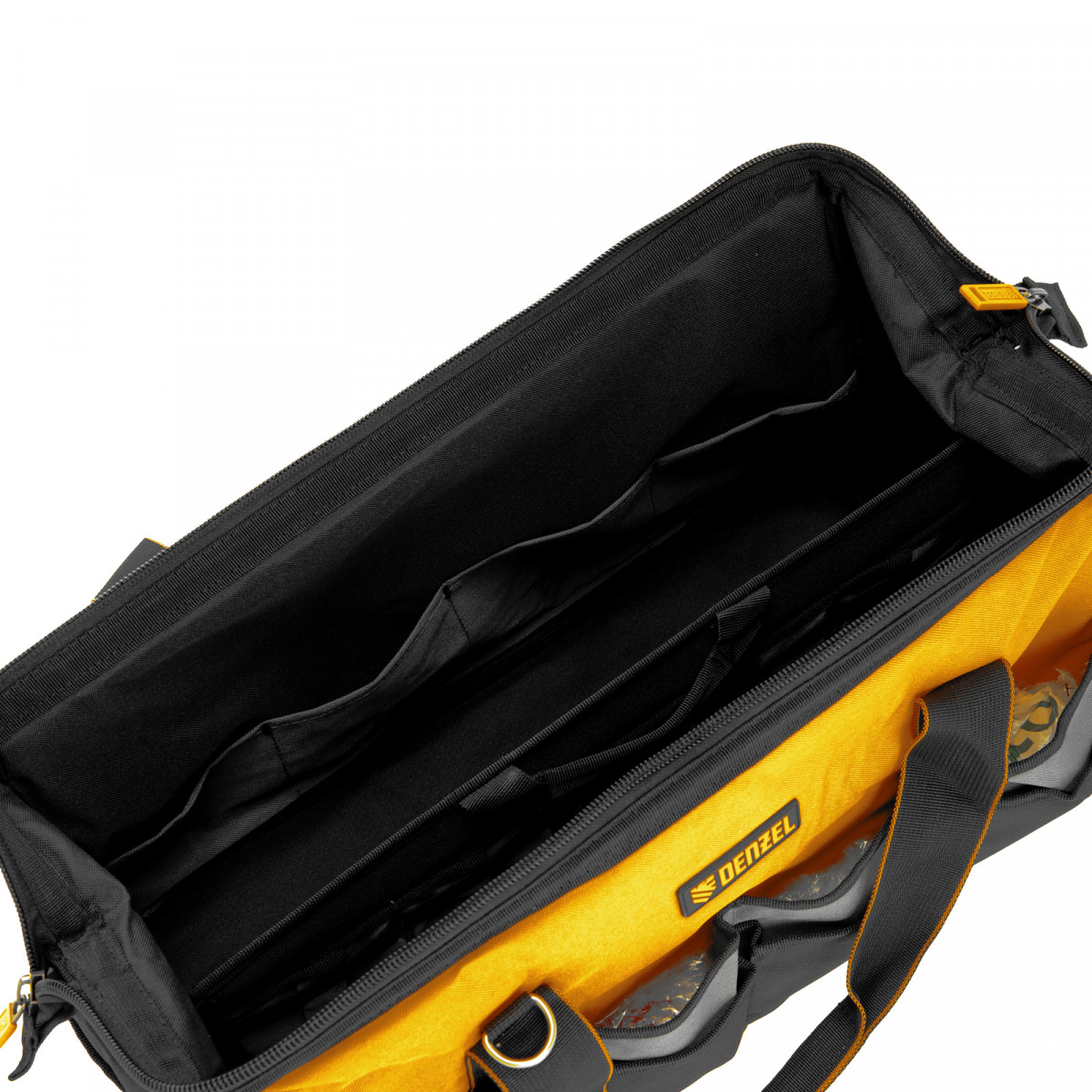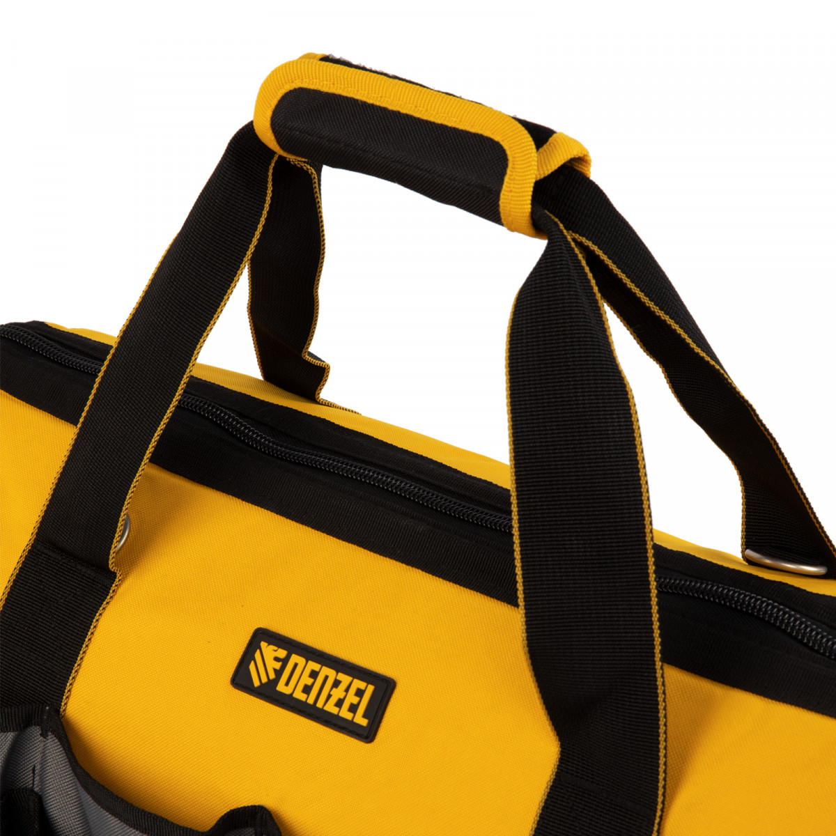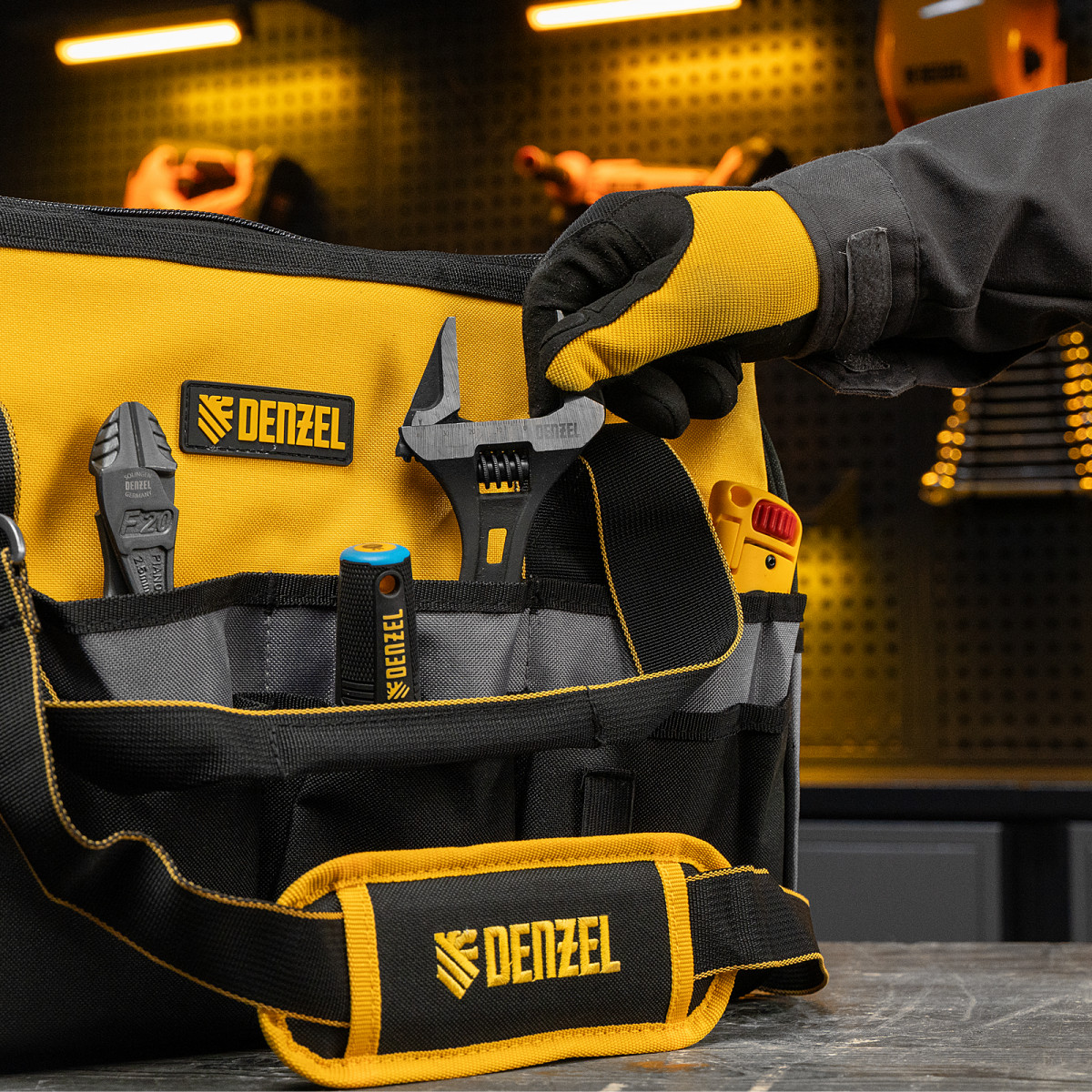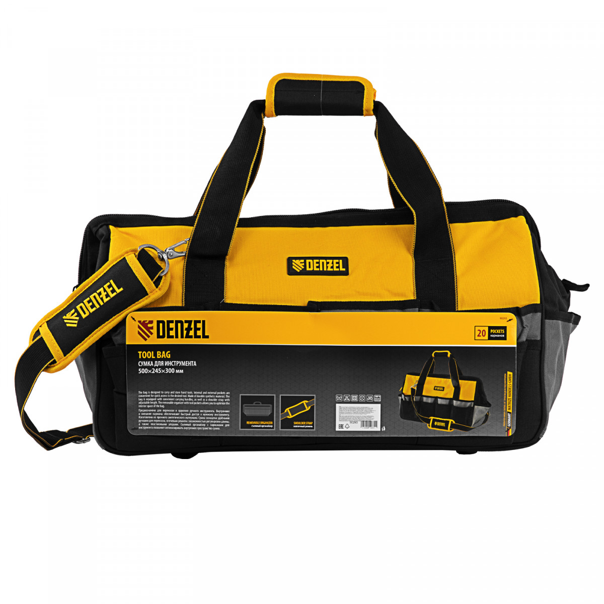Сумка Denzel 90293 габаритами 500 х 245 х 300 мм с 20 карманами (в том числе съемным органайзером на 10 карманов) и наплечным ремнем, вмещает большое количество инструментов и используется для их хранения и транспортировки. Пригодится монтажнику, сантехнику, мастеру на выезде и автовладельцу.