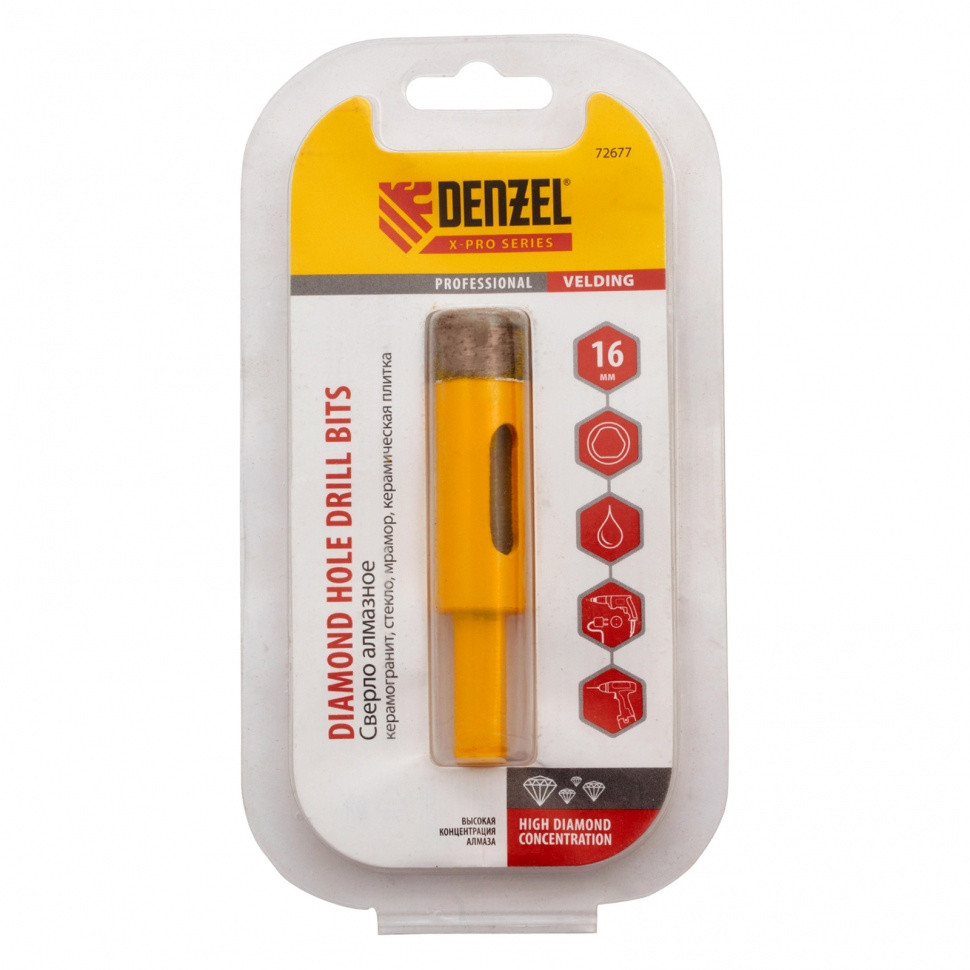 Сверло алмазное по керамограниту, 16 мм, мокрая резка, трехгранный хвостовик Denzel