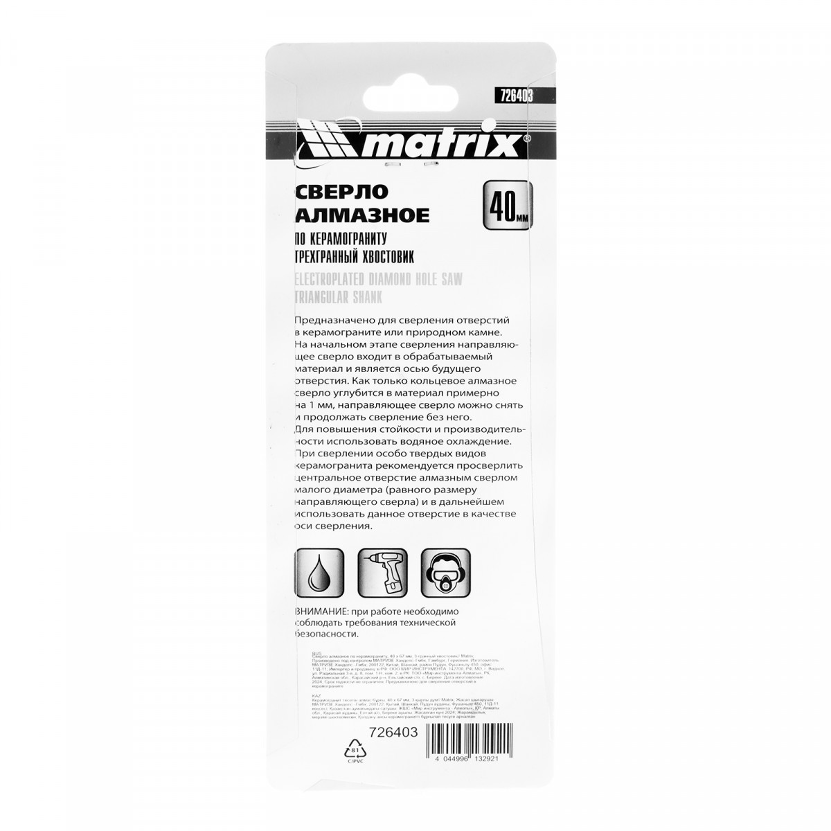 Универсальное алмазное сверло по керамограниту Matrix 726403 размером 40 х 67 мм, с 3-гранным хвостовиком, применяется для получения отверстий в стекле, плитке, кафеле. За счет высокой концентрации алмазов в режущем слое оно легко справляется со сверлением керамогранита. Сверло рассчитано на профессиональное использование с дрелями и шуруповертами. Водяное охлаждение в процессе работы значительно повышает срок службы оснастки.