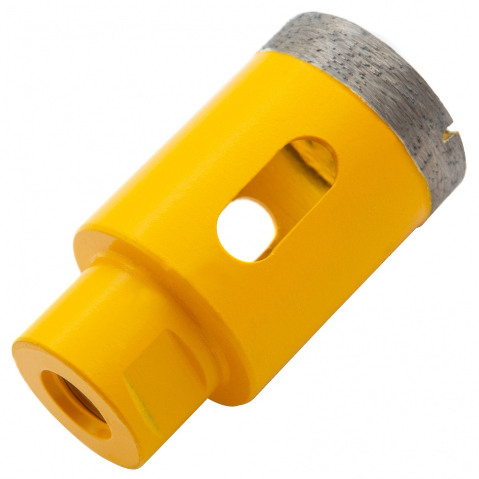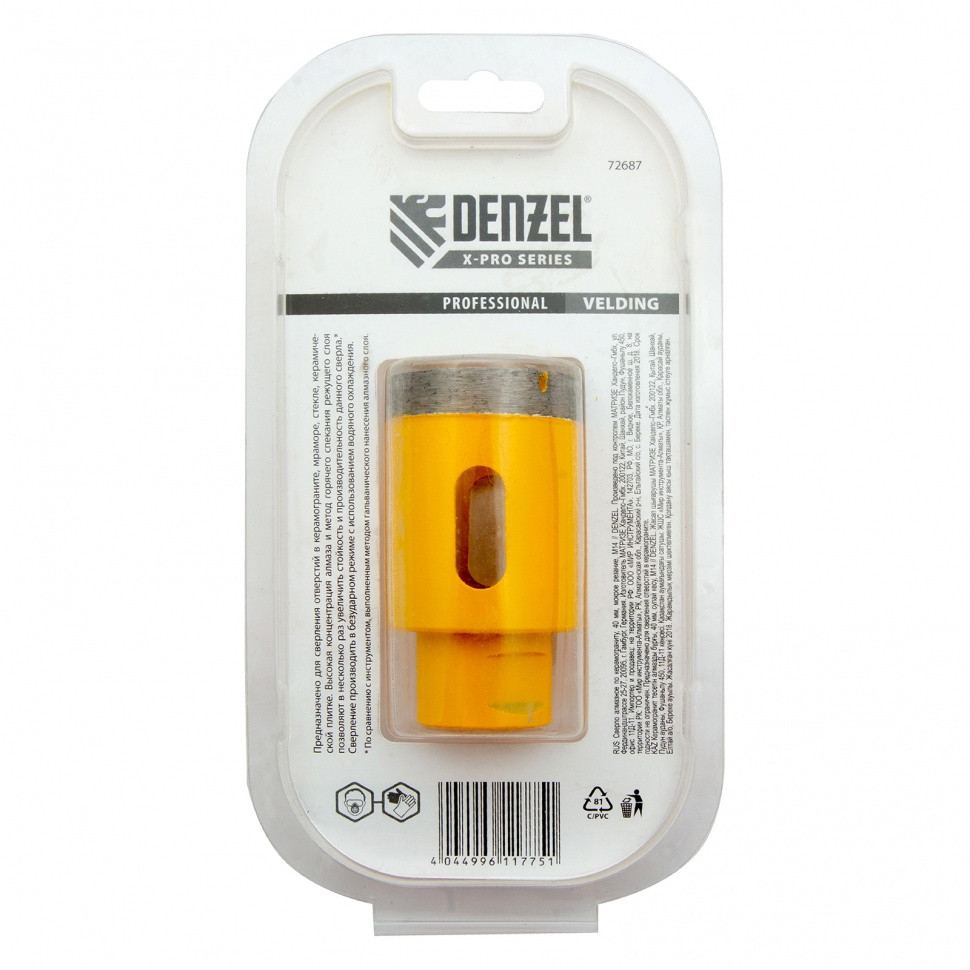 Алмазное сверло Denzel 72687 диаметром 40 мм, с резьбой М14, предназначено для «мокрого» сверления по керамограниту, мрамору, стеклу и керамической плитке. Позволяет получать ровные отверстия без сколов, используется для проведения ремонтных и отделочных работ. Сверло (коронку) устанавливают на вал углошлифовальной машины, благодаря чему скорость сверления увеличивается в несколько раз по сравнению с дрелью или шуруповертом. Применение водяного охлаждения повышает срок службы оснастки. Чтобы точно позиционировать сверло при сверлении дрелью, рекомендуется использовать кондуктор (арт. 72830).