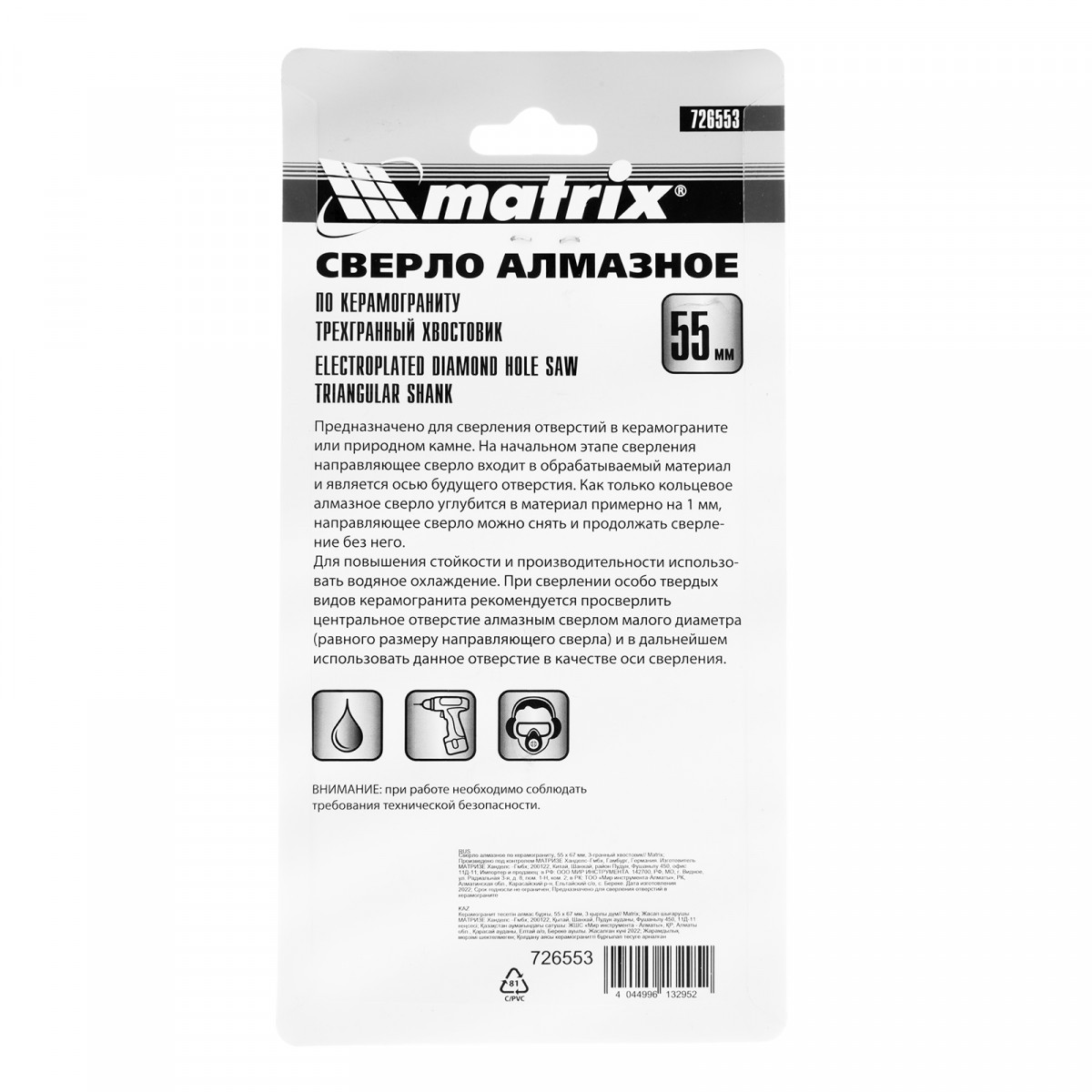 Сверло алмазное по керамограниту, 55 х 67 мм, трехгранный хвостовик Matrix