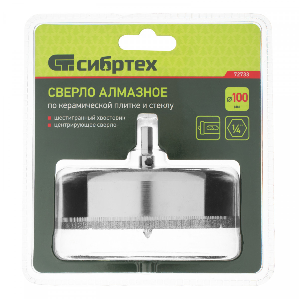 Сверло Сибртех 72733 размером 100 х 55 м, с шестигранным хвостовиком и центрирующим сверлом, позволяет получать отверстия в керамической плитке и стекле. Его устанавливают на дрель или шуруповерт, рекомендуемый диапазон рабочих оборотов 350-700 об/мин. Оснастка используется при выполнении бытовых ремонтных и отделочных работ.
