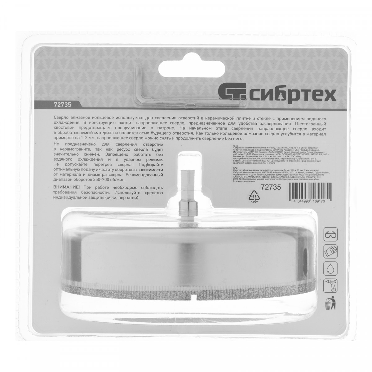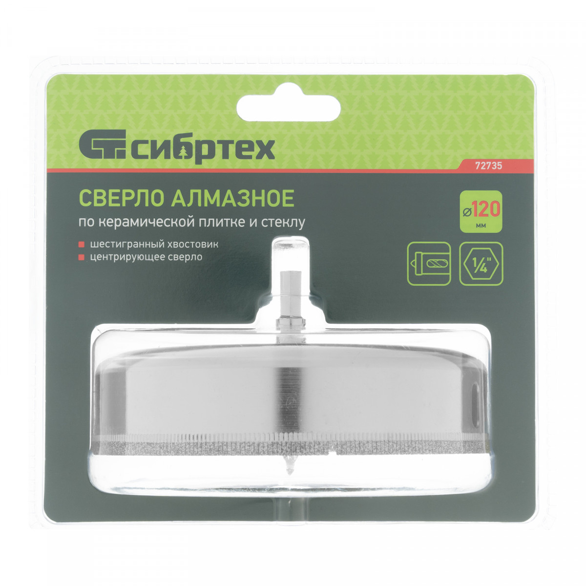 Сверло Сибртех 72735 размером 120 х 55 м, с шестигранным хвостовиком и центрирующим сверлом, позволяет получать отверстия в керамической плитке и стекле. Его устанавливают на дрель или шуруповерт, рекомендуемый диапазон рабочих оборотов 350-700 об/мин. Оснастка используется при выполнении бытовых ремонтных и отделочных работ.