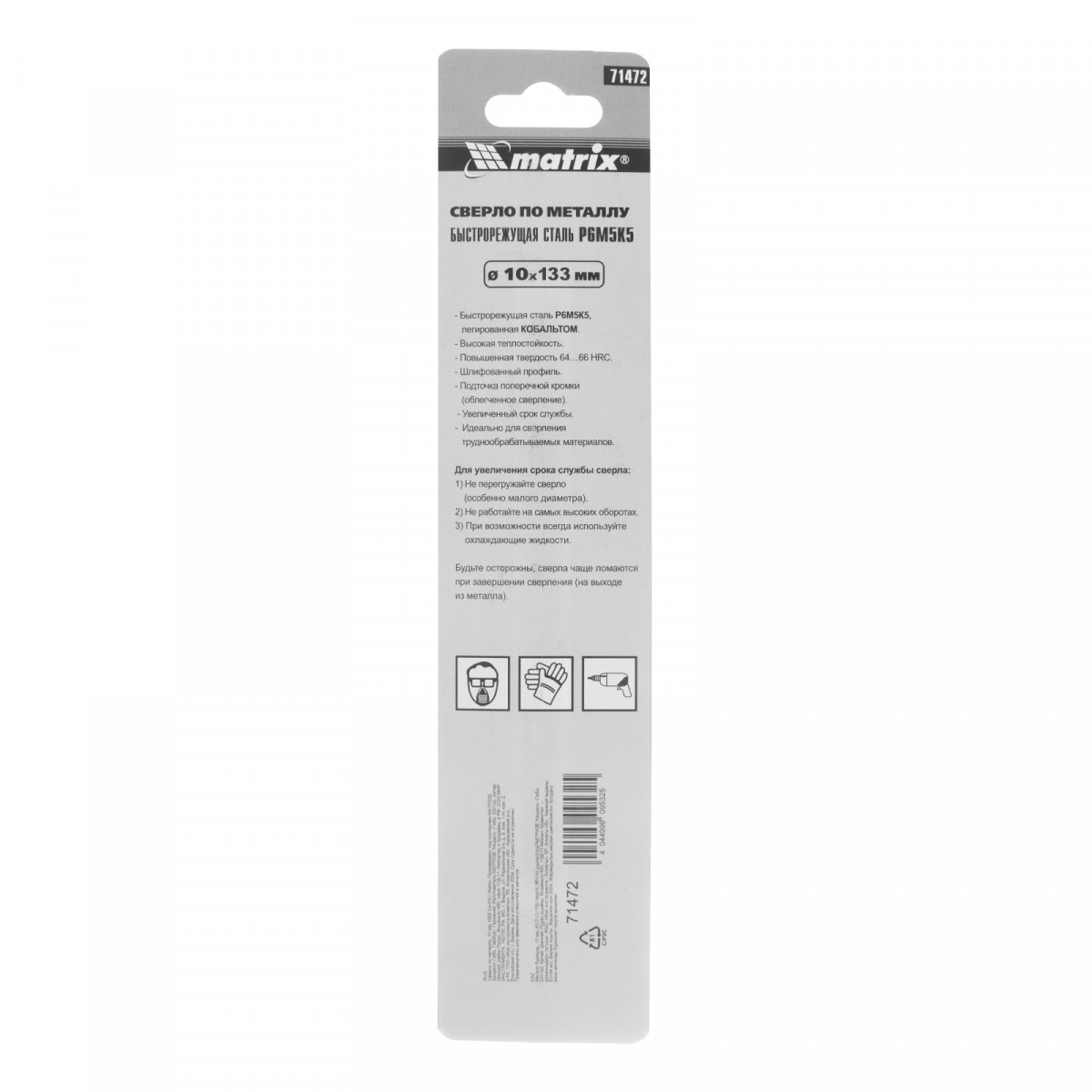 Сверло Matrix 71472 диаметром 10 мм, из стали HSS Co-5%, имеет угол заточки 135°, оптимальный для сверления легированных и цветных металлов. Подходит для профессионального использования на строительной площадке.