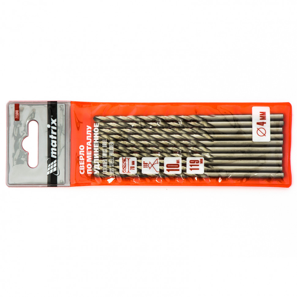 Полированное удлиненное сверло по металлу Matrix 715040 размером 4,0 х 119 мм, из стали HSS, с цилиндрическим хвостовиком, 10 шт. в упаковке, благодаря удлиненному профилю подходит для глубокого сверления. Угол заточки сверл составляет 118° и является оптимальным для работы с черными металлами, сталью, чугуном и твердой бронзой.