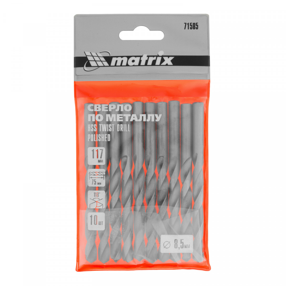 Полированное сверло по металлу Matrix 71585 из стали HSS, с цилиндрическим хвостовиком, 10 шт. в упаковке, используется для получения отверстий диаметром 8,5 мм. Угол заточки составляет 118 градусов, поэтому сверло оптимально для работы с черными металлами, сталью, чугуном и твердой бронзой.